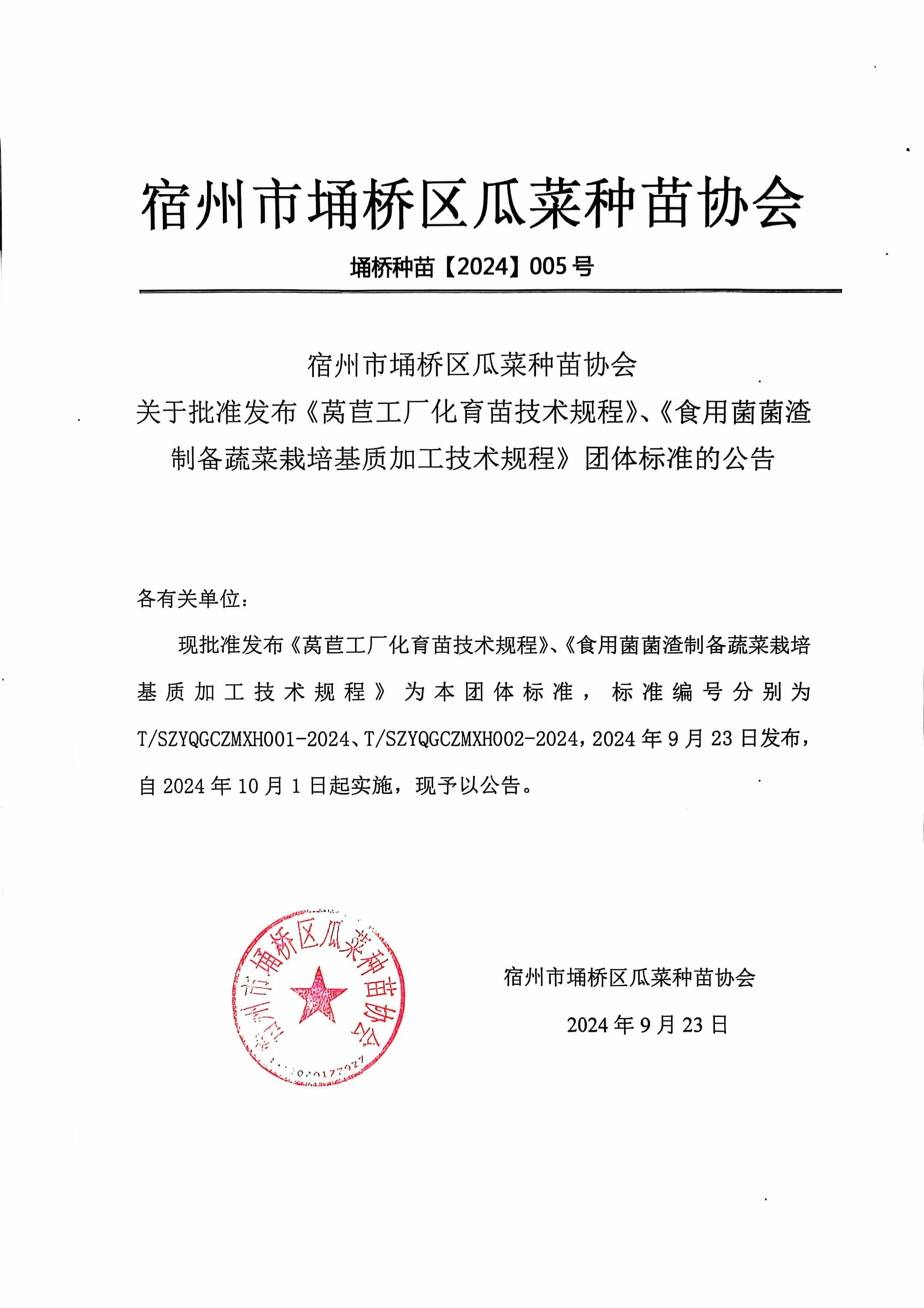 现批准发布《莴苣工厂化育苗技术规程》、《食用菌菌渣制备蔬菜栽培基质加工技术规程》为本团体标准,标准编号分别为T/SZYQGCZMXH001-2024、T/SZYQGCZMXH002-2024,2024年9月23日发布,自2024年10月1日起实施,现予以公告。