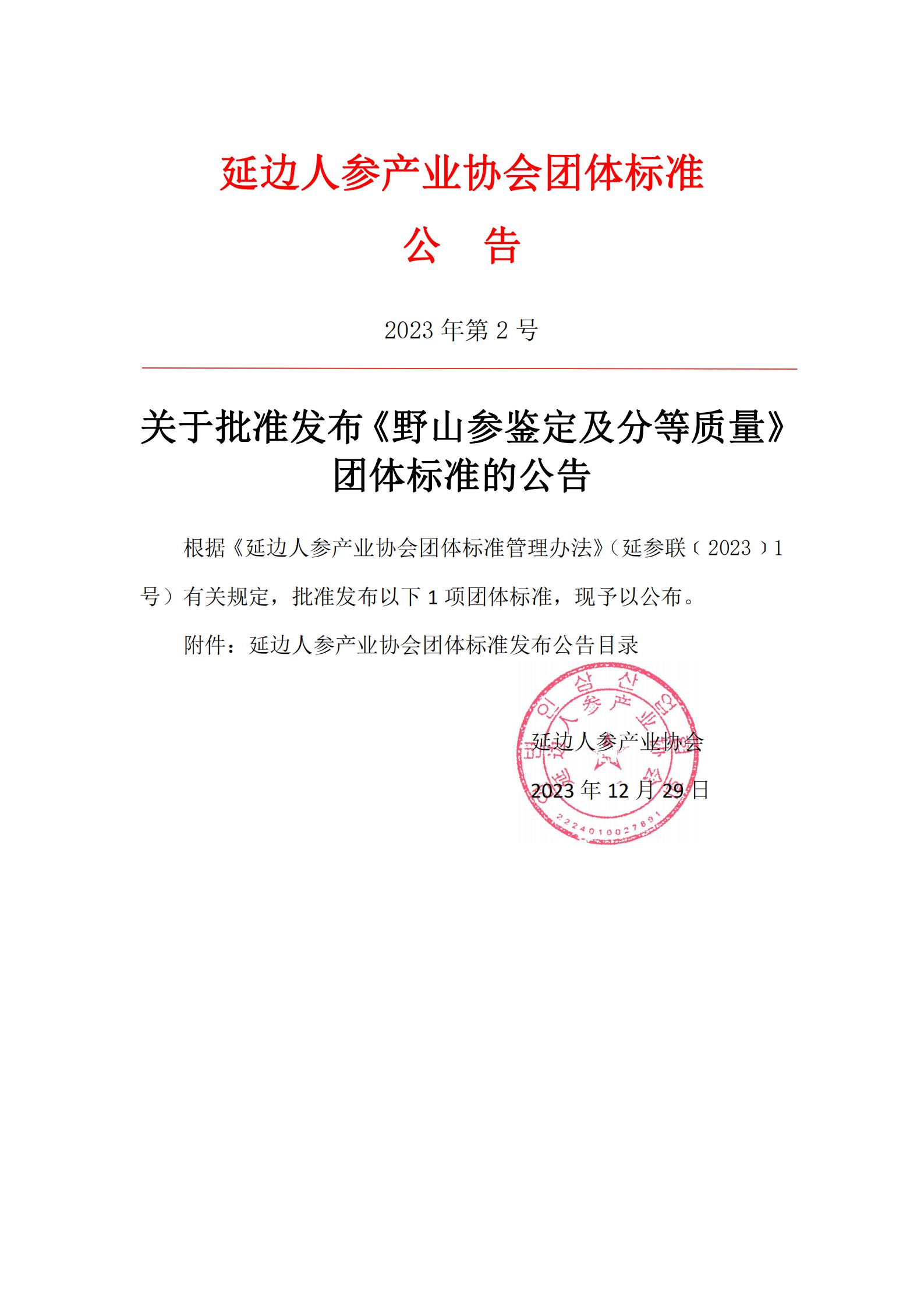 延边人参产业协会关于批准发布《野山参鉴定及分等质量》等1项团体标准的公告