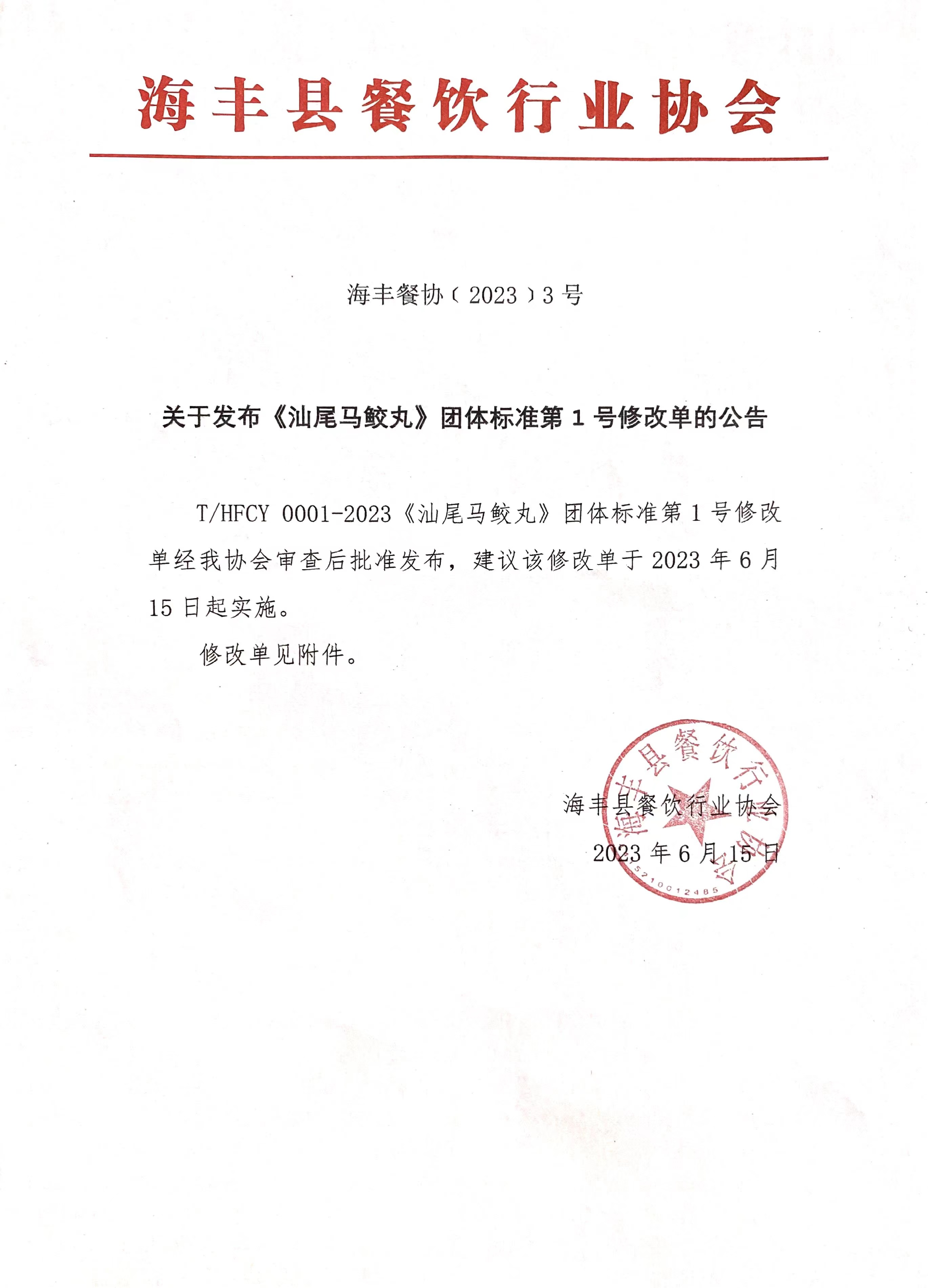 附件:1.海丰县餐饮行业协会关于发布第1号修改单的公告