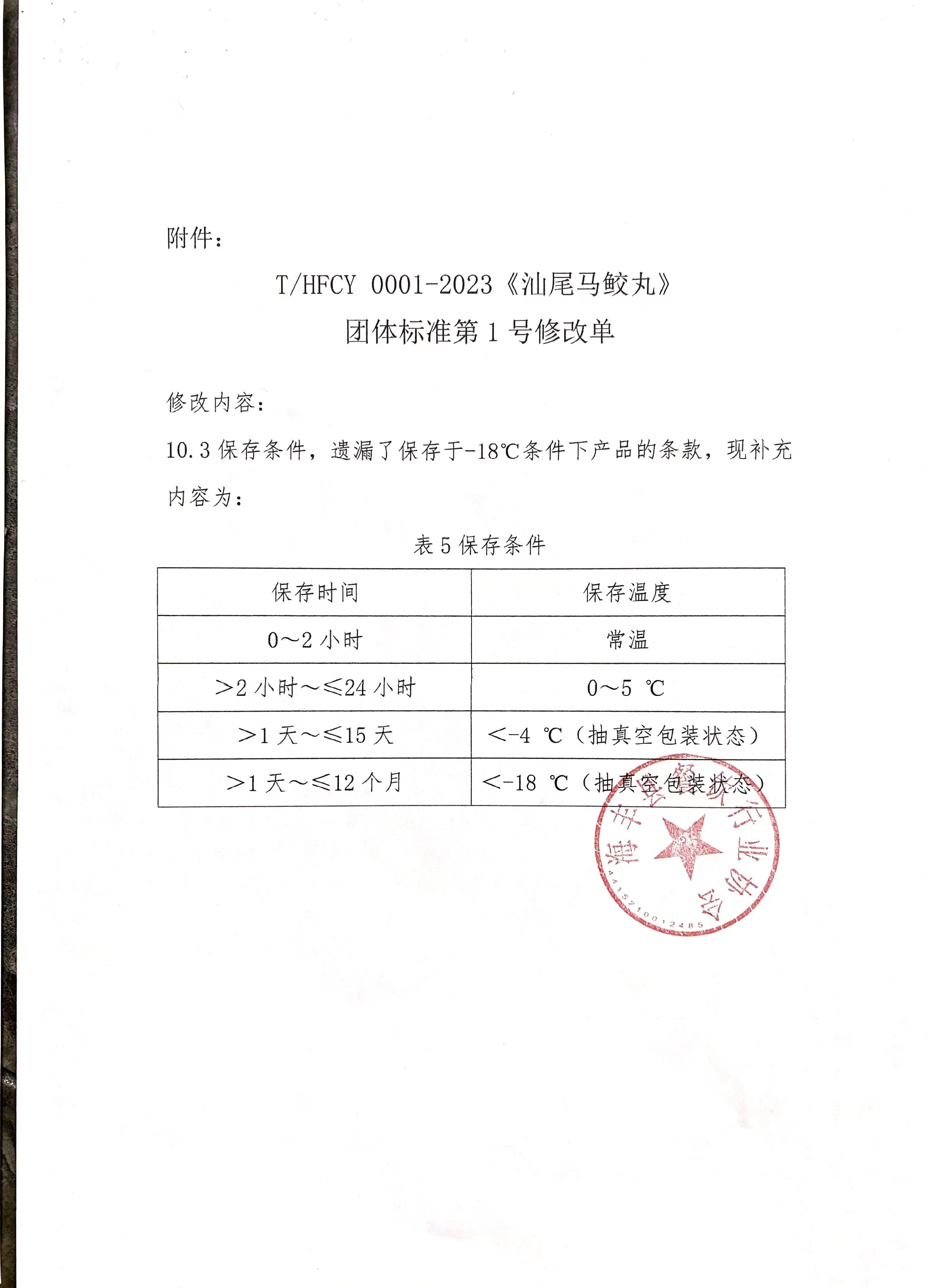 T/HFCY 0001—2023《汕尾马鲛丸》团体标准第1号修改单经我团体审查批准发布。建议该修改单于2023年6月15日起实施。 修改单见附件。