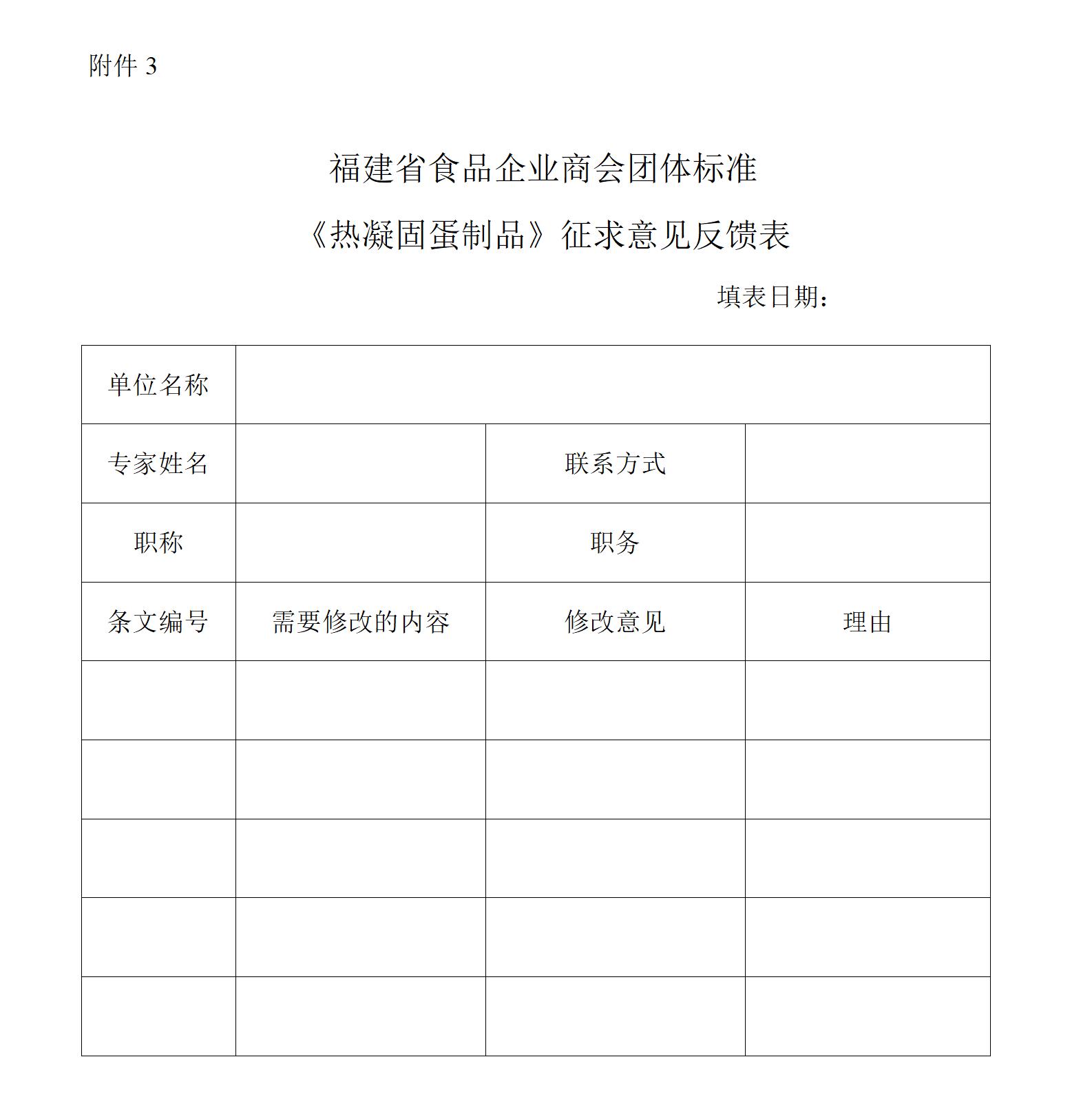 福建省食品企业商会关于团体标准《热凝固蛋制品》征求意见函