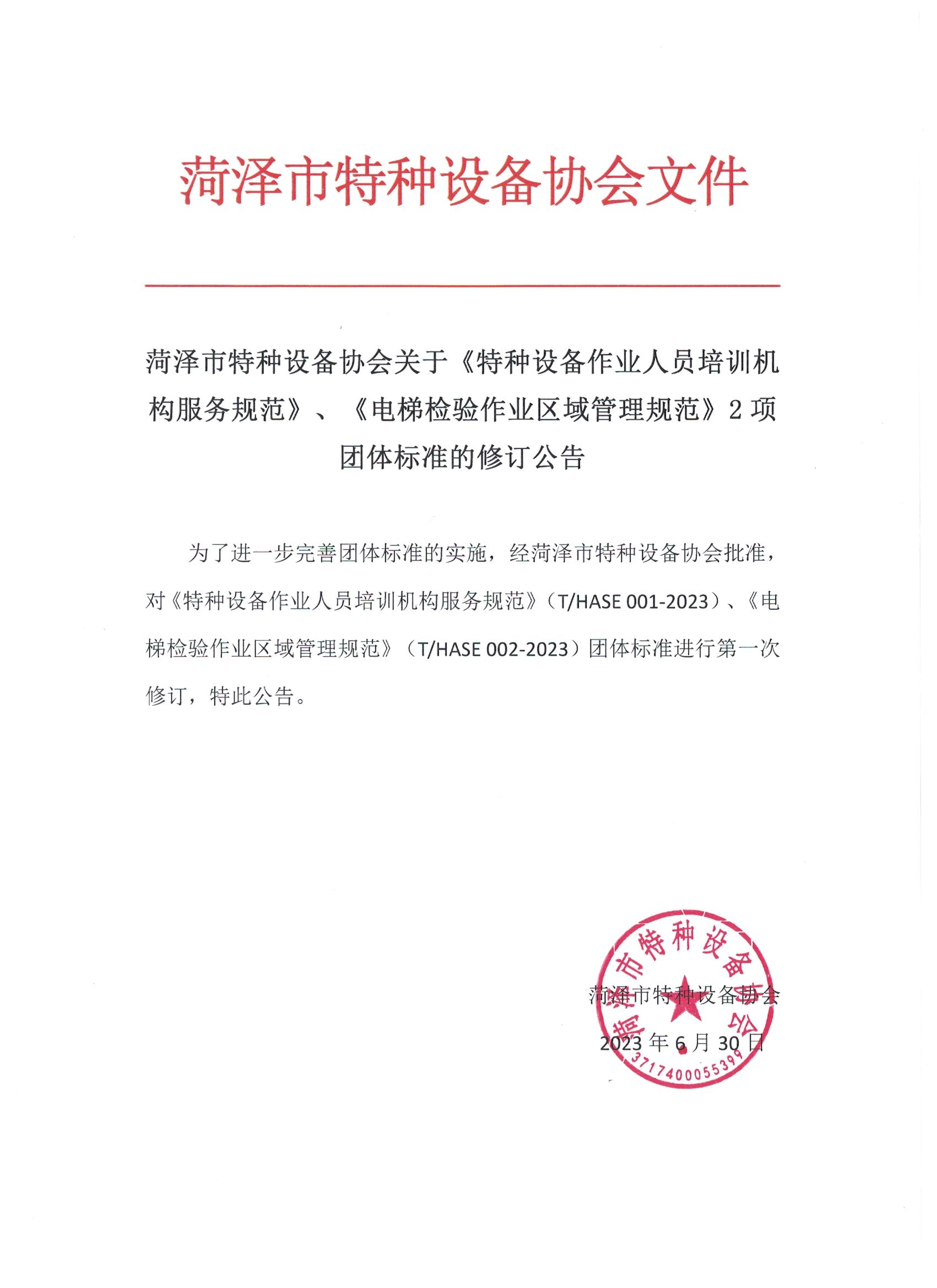 为了进一步完善团体标准的实施,经菏泽市特种设备协会批准,对《特种设备作业人员培训机构服务规范》(T/HASE 001-2023)、《电梯检验作业区域管理规范》(T/HASE 002-2023)团体标准进行第一次修订,特此公告。