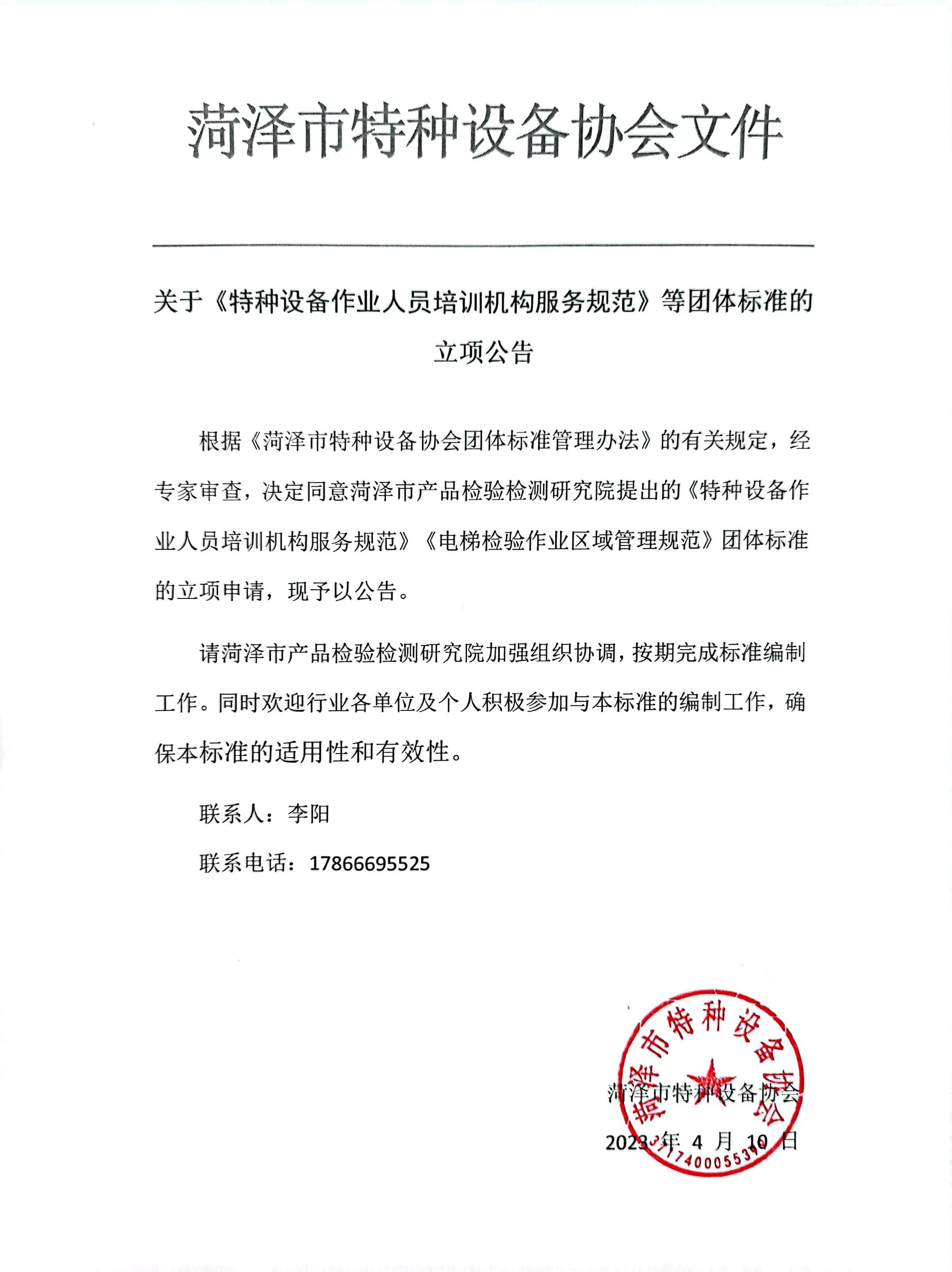 菏泽市特种协会设备协会关于《特种设备作业人员培训机构服务规范》等团体标准的立项公告
