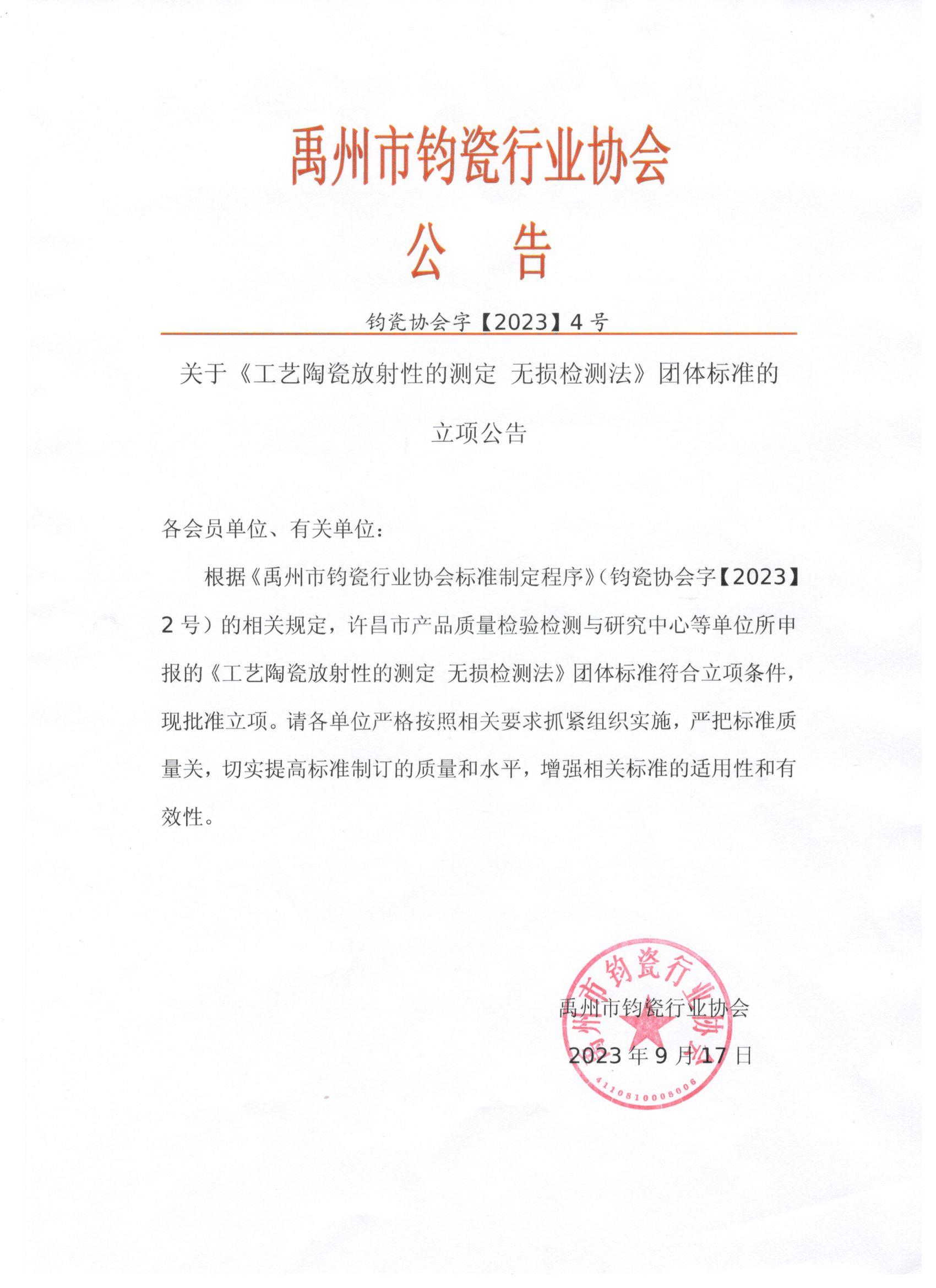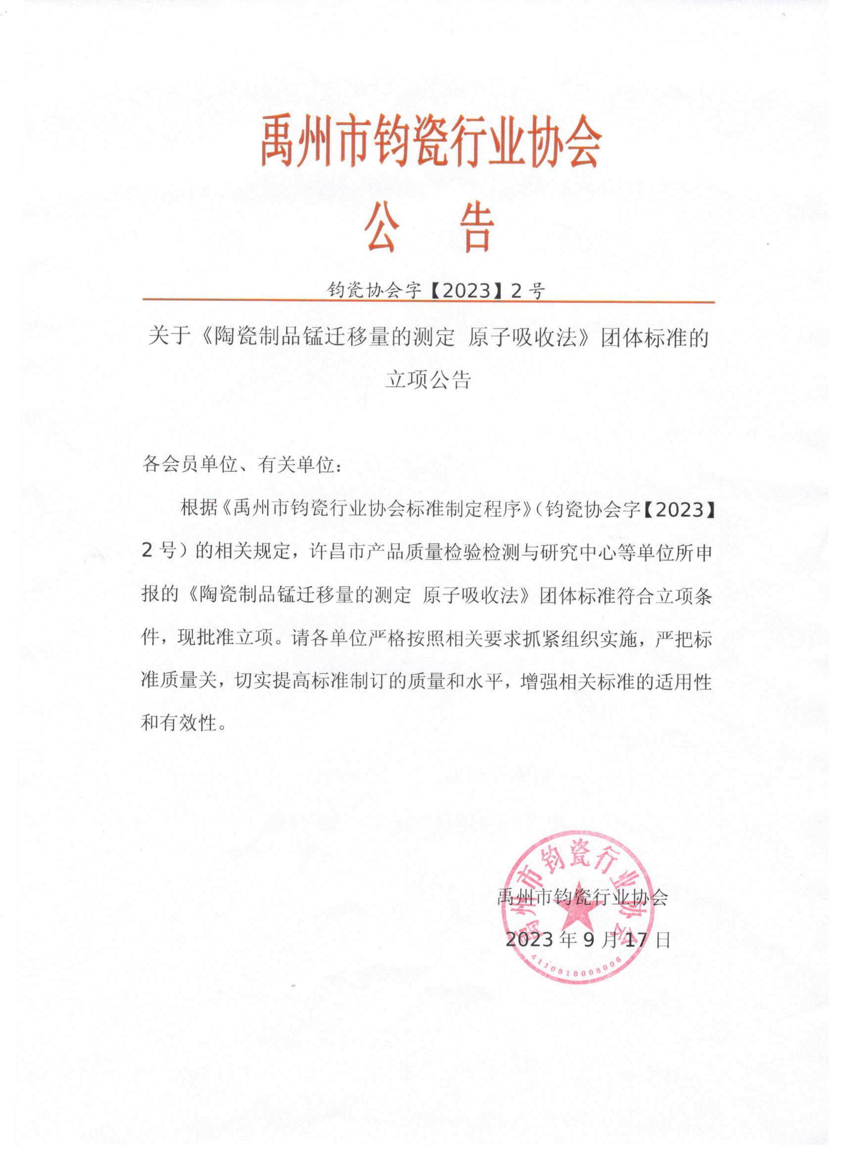根据《禹州市钧瓷行业协会标准制定程序》(钧瓷协会字【2023】2号)的相关规定,许昌市产品质量检验检测与研究中心等单位所申报的《陶瓷制品锰迁移量的测定 原子吸收法》、《陶瓷制品锰迁移量的测定 原子吸收法 》、《工艺陶瓷放射性的测定 无损检测法》、《抗菌日用钧瓷制品抗菌性能》4团体标准符合立项条件,现批准立项。 请各单位严格按照相关要求抓紧组织实施,严把标准质量关,切实提高标准制订的质量和水平,增强相关标准的适用性和有效性。