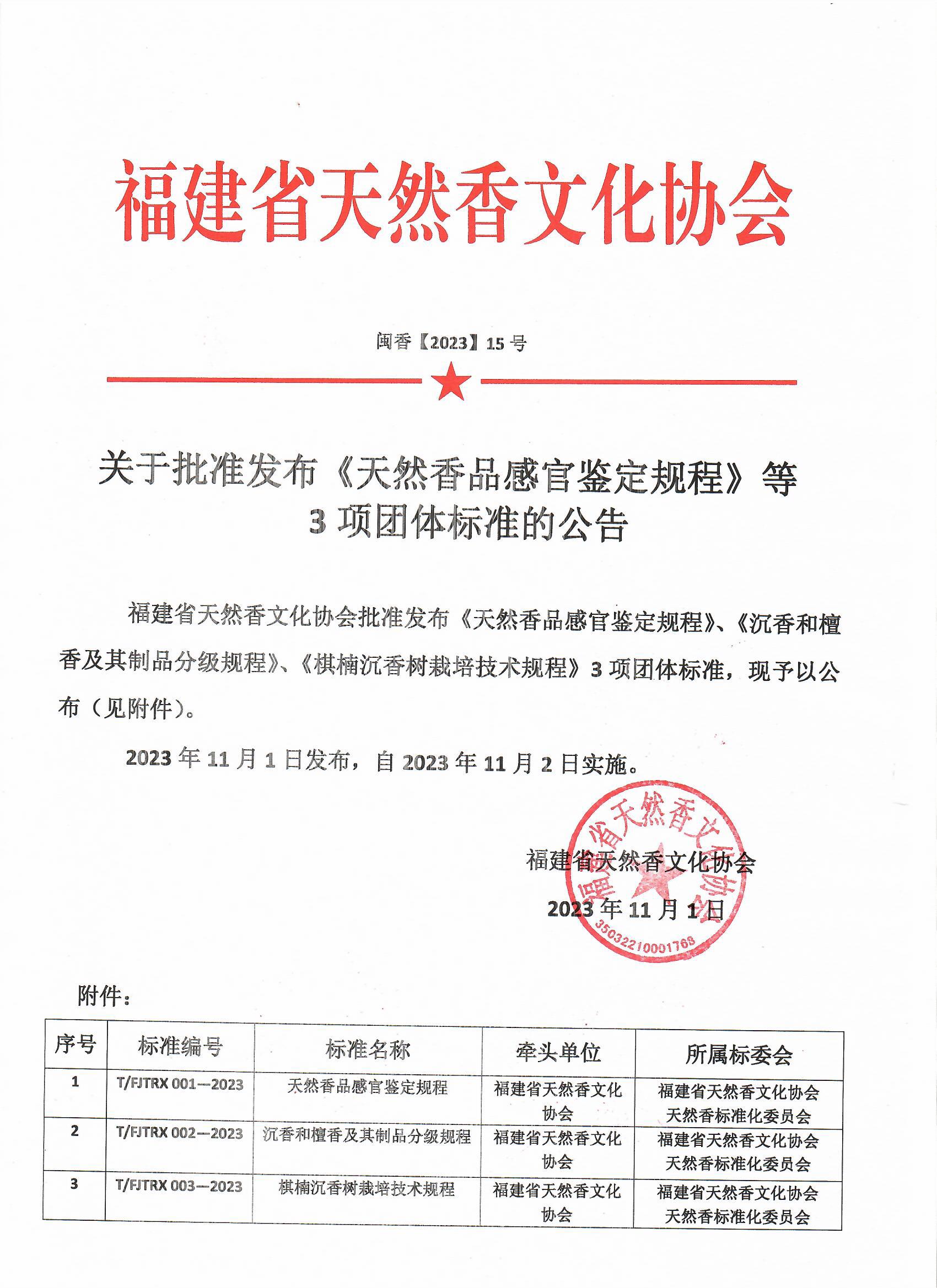 福建省天然香文化协会批准发布《天然香品感官鉴定规程》、《沉香和檀香及其制品分级规程》、《棋楠沉香树栽培技术规程》3项团体标准,现予以公布(见附件)。