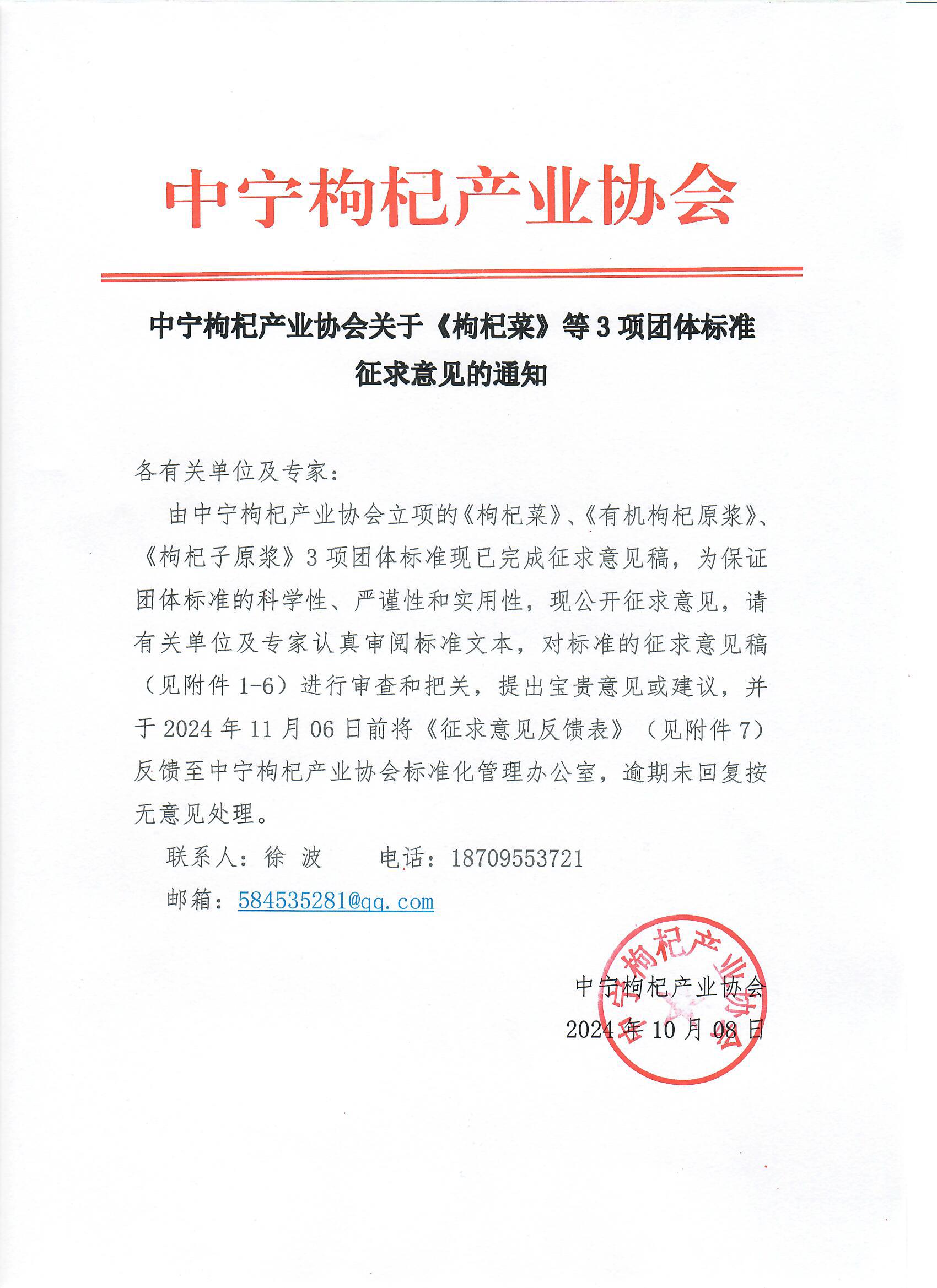 由中宁枸杞产业协会立项的《枸杞菜》、《有机枸杞原浆》、《枸杞子原浆》3项团体标准现已完成征求意见稿,为保证团体标准的科学性、严谨性和实用性,现公开征求意见,请有关单位及专家认真审阅标准文本,对标准的征求意见稿(见附件1-6)进行审查和把关,提出宝贵意见或建议,并于2024年11月06日前将《征求意见反馈表》(见附件7)反馈至中宁枸杞产业协会标准化管理办公室,逾期未回复按无意见处理。
