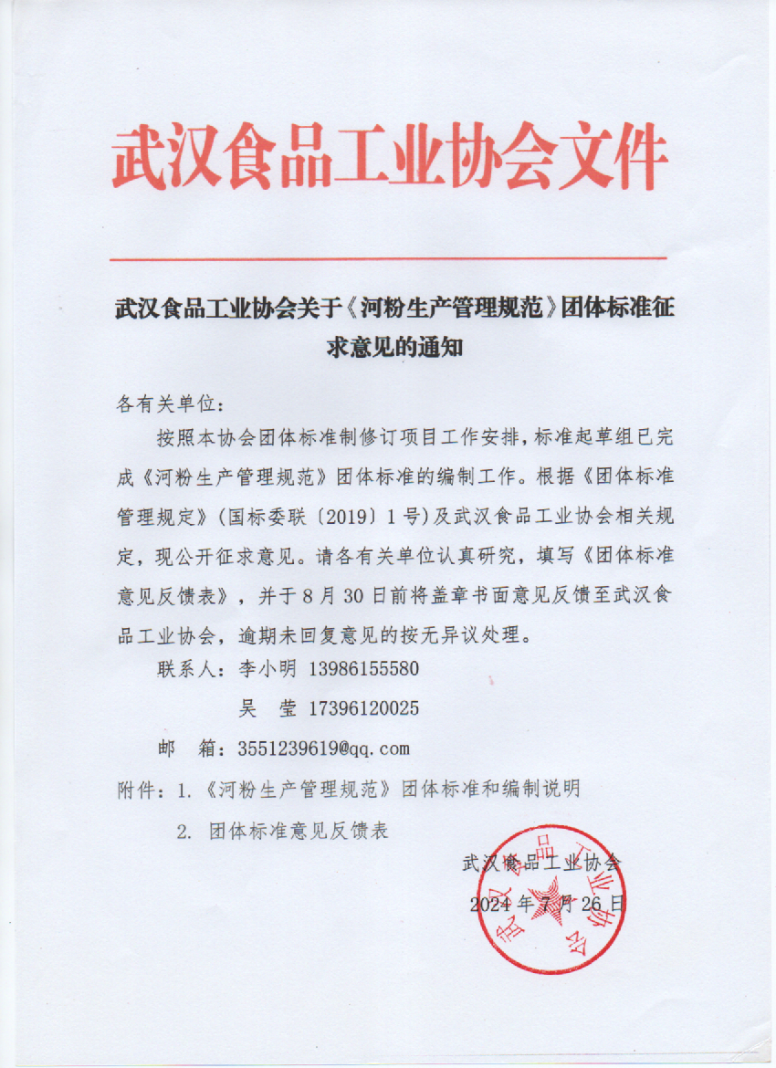 按照本协会团体标准制修订项目工作安排,标准起草组已完成《河粉生产管理规范》团体标准的编制工作。根据《团体标准管理规定》(国标委联〔2019〕1号)及武汉食品工业协会相关规定,现公开征求意见。请各有关单位认真研究,填写《团体标准意见反馈表》,并于8月30日前将盖章书面意见反馈至武汉食品工业协会,逾期未回复意见的按无异议处理。