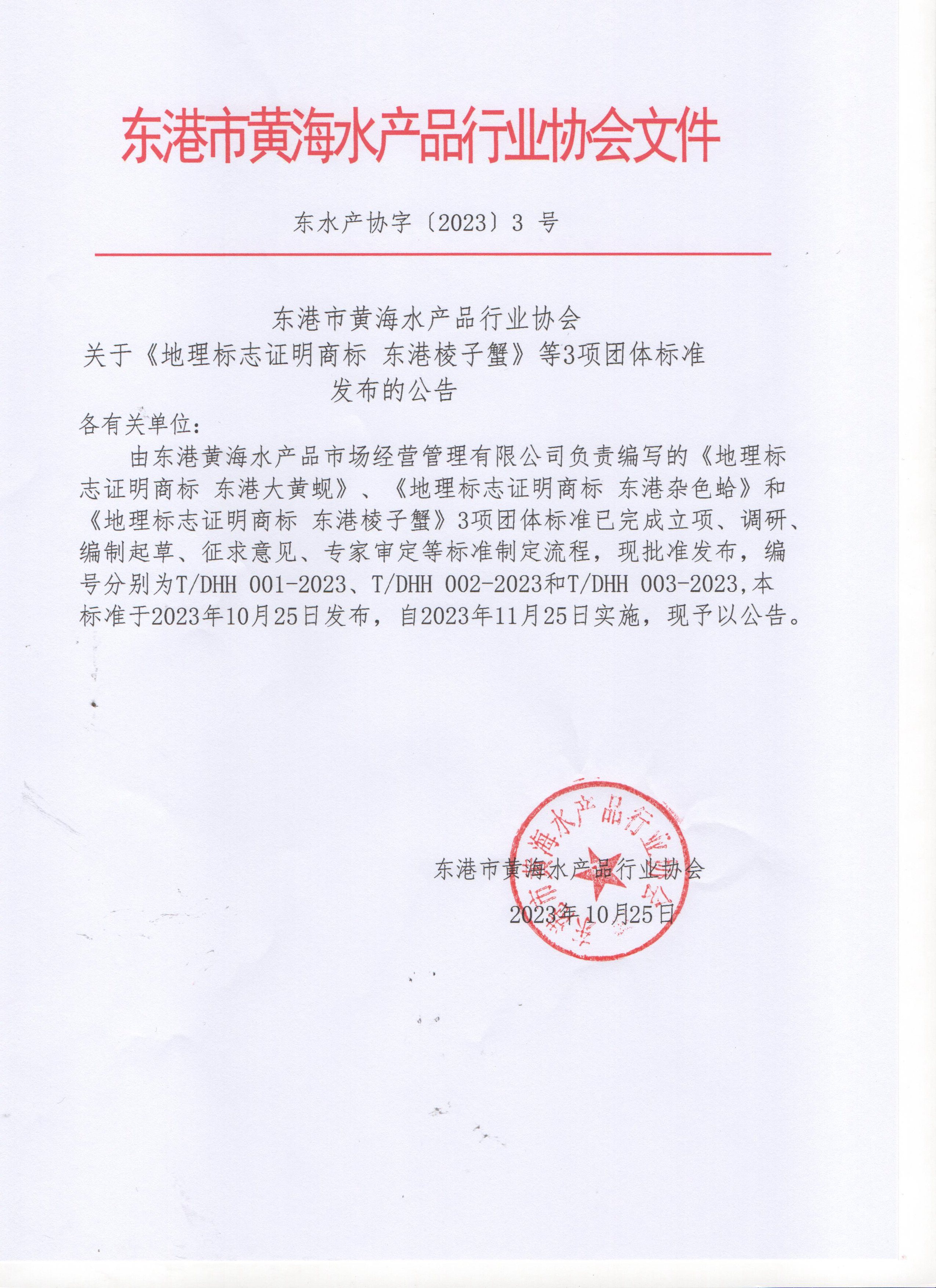 由东港黄海水产品市场经营管理有限公司负责编写的《地理标志证明商标 东港大黄蚬》、《地理标志证明商标 东港杂色蛤》和《地理标志证明商标 东港棱子蟹》3项团体标准已完成立项、调研、编制起草、征求意见、专家审定等标准制定流程,现批准发布,编号分别为T/DHH 001-2023、T/DHH 002-2023和T/DHH 003-2023,本标准于2023年10月25日发布,自2023年11月25日实施,现予以公告。