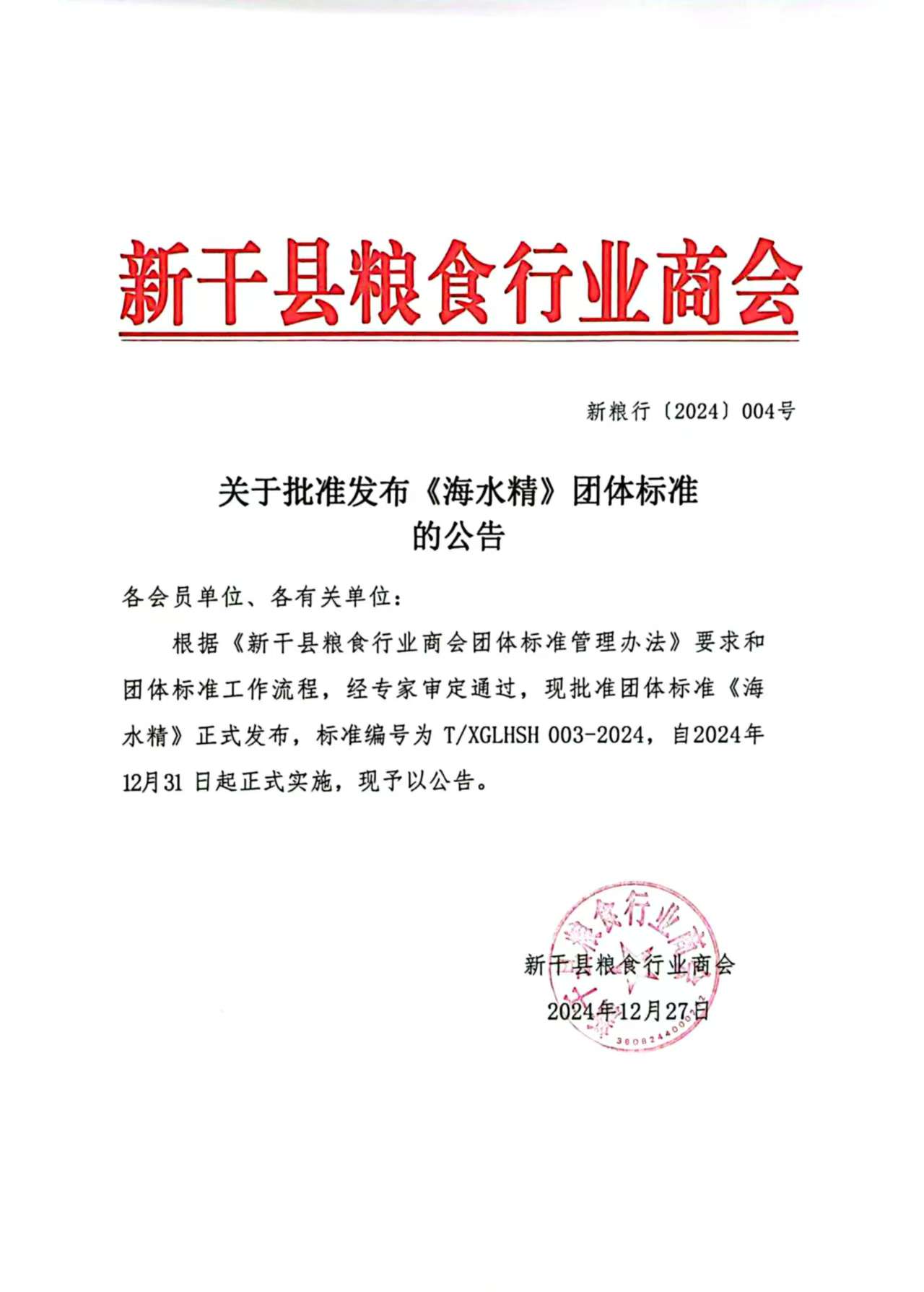 根据《新干县粮食行业商会团体标准管理办法》要求和团体标准工作流程,经专家审定通过,现批准团体标准《海水精》正式发布,标准编号为T/XGLHSH 003-2024,自2024年12 月31日起正式实施,现予以公告。