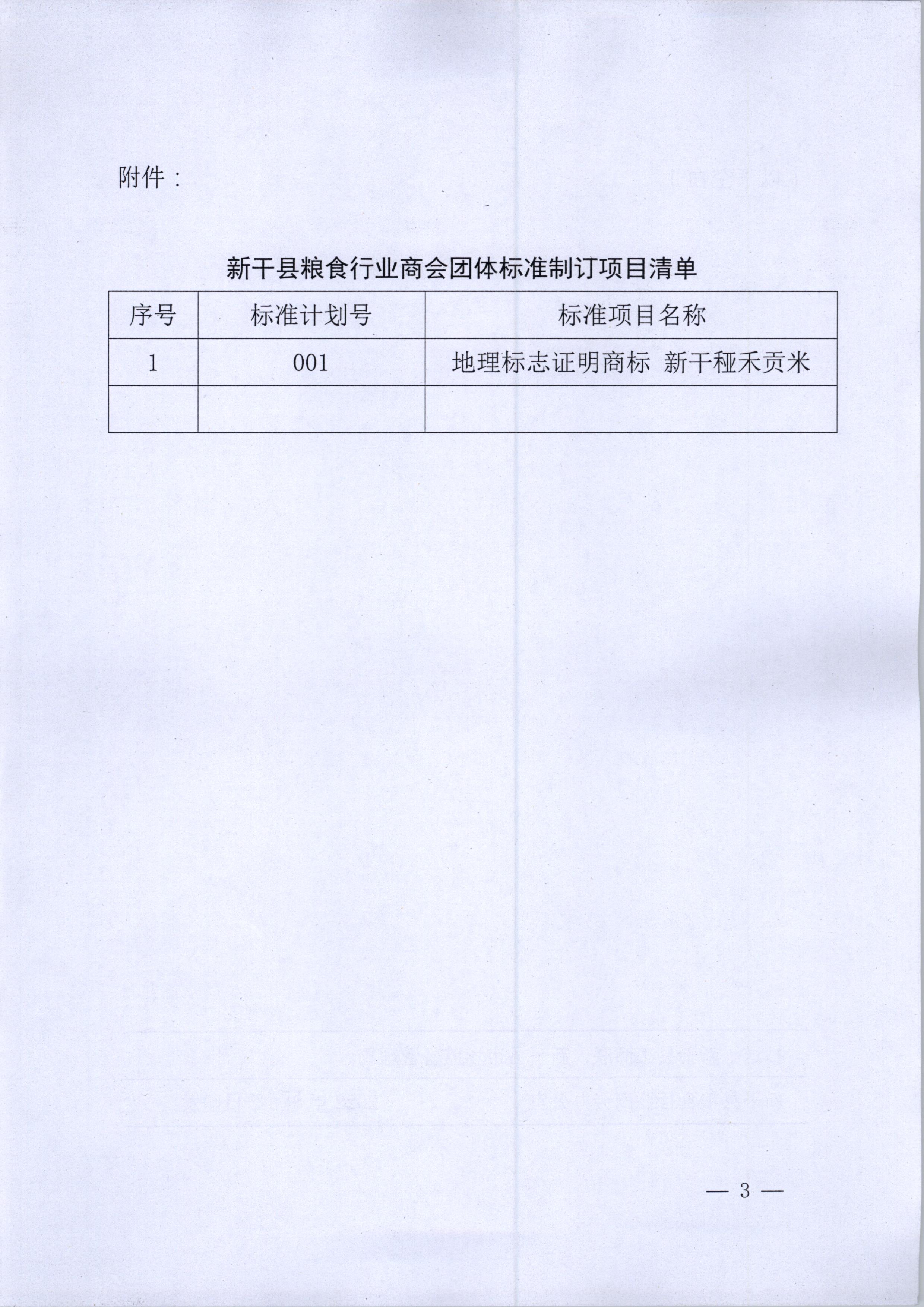根据《新干县粮食行业商会团体标准管理办法》的相关规定,《地理标志证明商标 新干?禾贡米》团体标准经过专家立项评审。经评审符合立项条件,批准立项。现将标准项目名称、标准计划号在全国团体标准信息平台(www.ttbz.org.cn)予以公示,公示期为5日,公示期间如有任何建议和要求,请与新干县粮食行业商会联系。