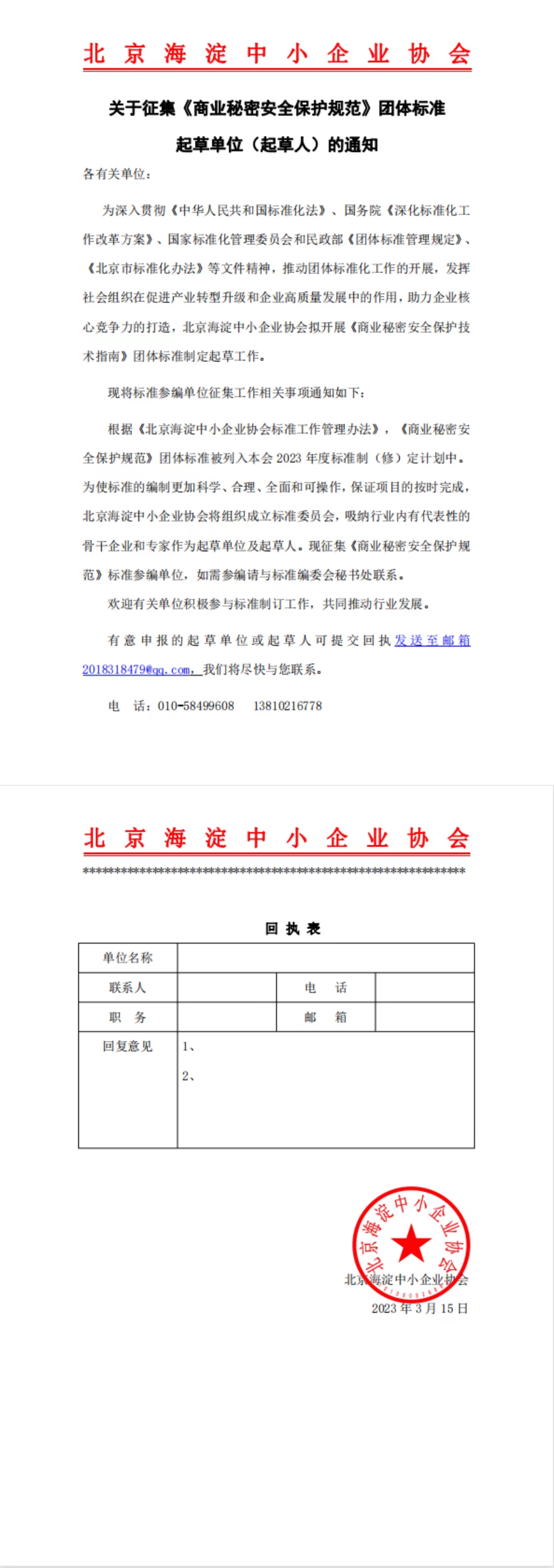为深入贯彻《中华人民共和国标准化法》、国务院《深化标准化工作改革方案》、国家标准化管理委员会和民政部《团体标准管理规定》、《北京市标准化办法》等文件精神,推动团体标准化工作的开展,发挥社会组织在促进产业转型升级和企业高质量发展中的作用,助力企业核心竞争力的打造,北京海淀中小企业协会拟开展《商业秘密安全保护技术指南》团体标准制定起草工作。