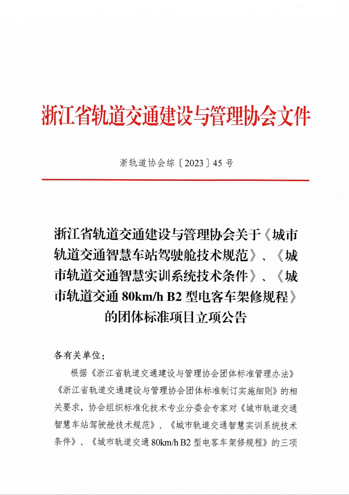 根据《浙江省轨道交通建设与管理协会团体标准管理办法》《浙江省轨道交通建设与管理协会团体标准制订实施细则》的相关要求,协会组织标准化技术专业分委会专家对《城市轨道交通智慧车站驾驶舱技术规范》、《城市轨道交通智慧实训系统技术条件》、《城市轨道交通80km/h B2型电客车架修规程》的三项团体标准项目进行了立项审查,经专家组评审,符合立项条件,批准立项,现将对标准项目名称、主要起草单位等信息在全国团体标准信息平台(www.ttbz.org.cn)予以公示,公示期为5个工作日。
