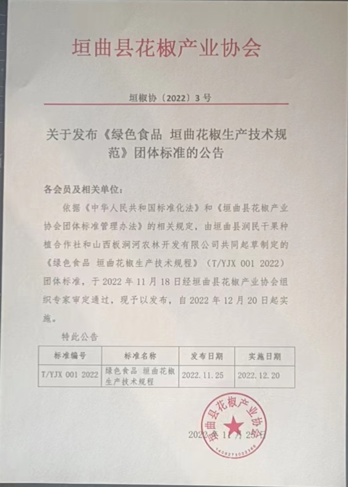 垣曲县花椒产业协会关于发布《绿色食品 垣曲花椒生产技术规范》团体标准的公告