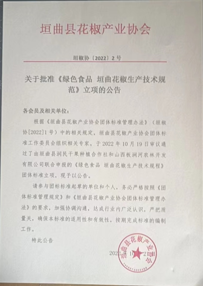 垣曲县花椒产业协会关于批准《绿色食品 垣曲花椒生产技术规范》立项的公告