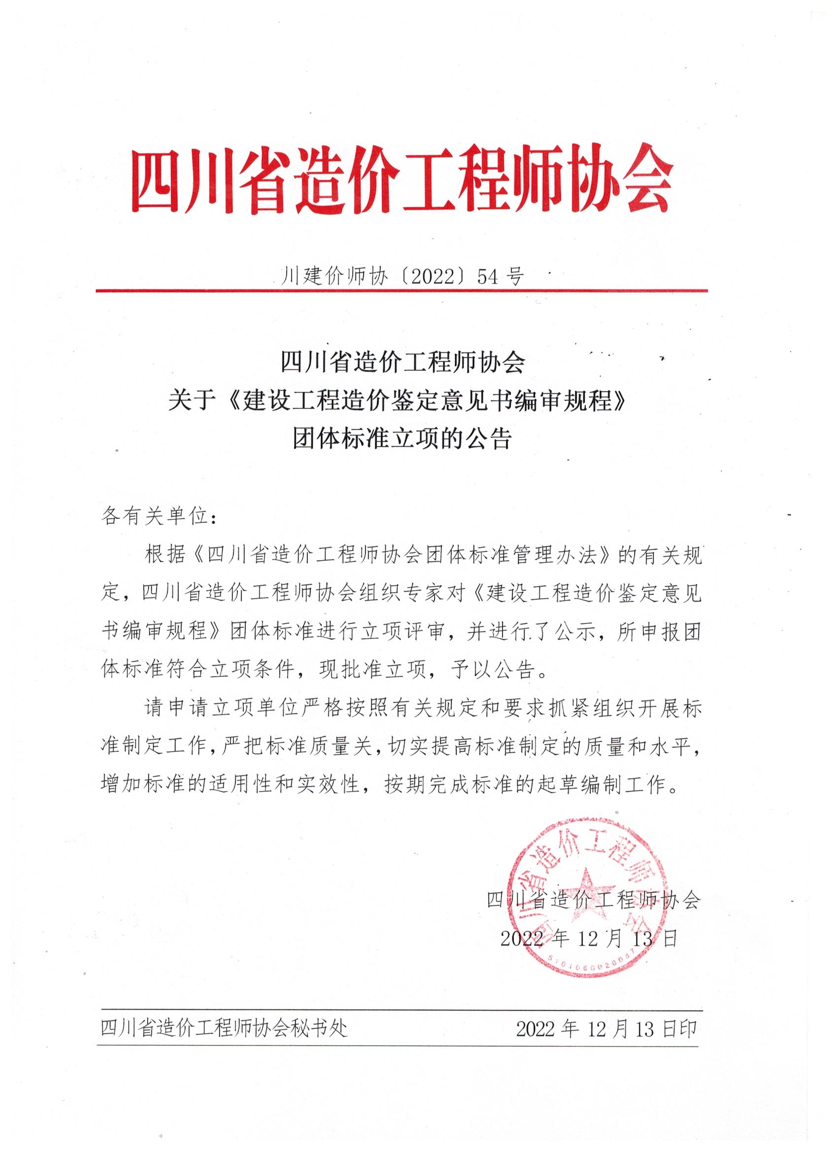 根据《四川省造价工程师协会团体标准管理办法》的有关规定,四川省造价工程师协会组织专家对《建设工程造价鉴定意见书编审规程》团体标准进行立项评审,并进行了公示,所申报团体标准符合立项条件,现批准立项,予以公告。
