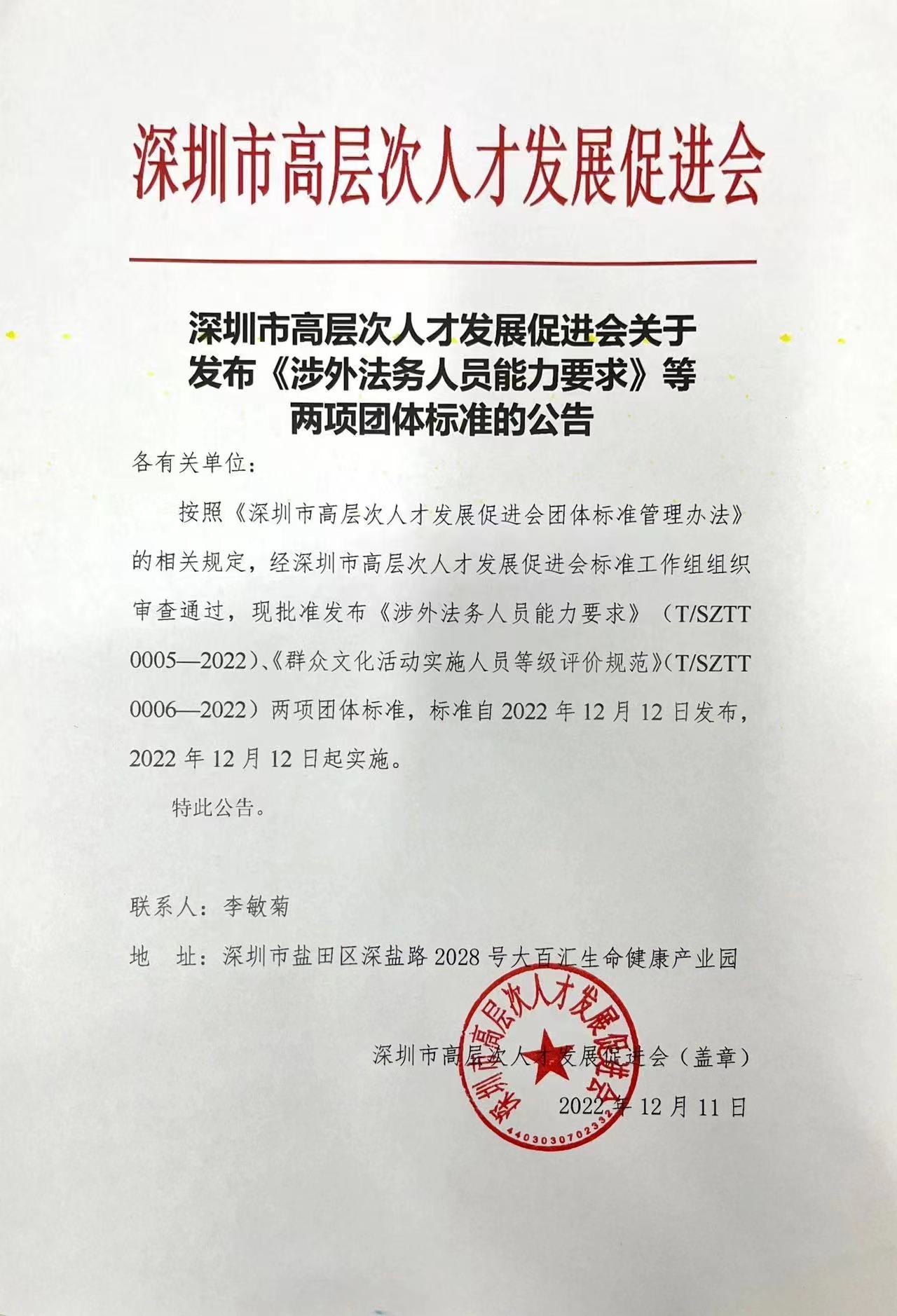 按照《深圳市高层次人才发展促进会团体标准管理办法》的相关规定,经深圳市高层次人才发展促进会标准工作组组织审查通过,现批准发布《涉外法务人员能力要求》(T/SZTT 0005—2022)、《群众文化活动实施人员等级评价规范》(T/SZTT 0006—2022)两项团体标准,标准自2022年12月12日发布,2022年12月12日起实施。