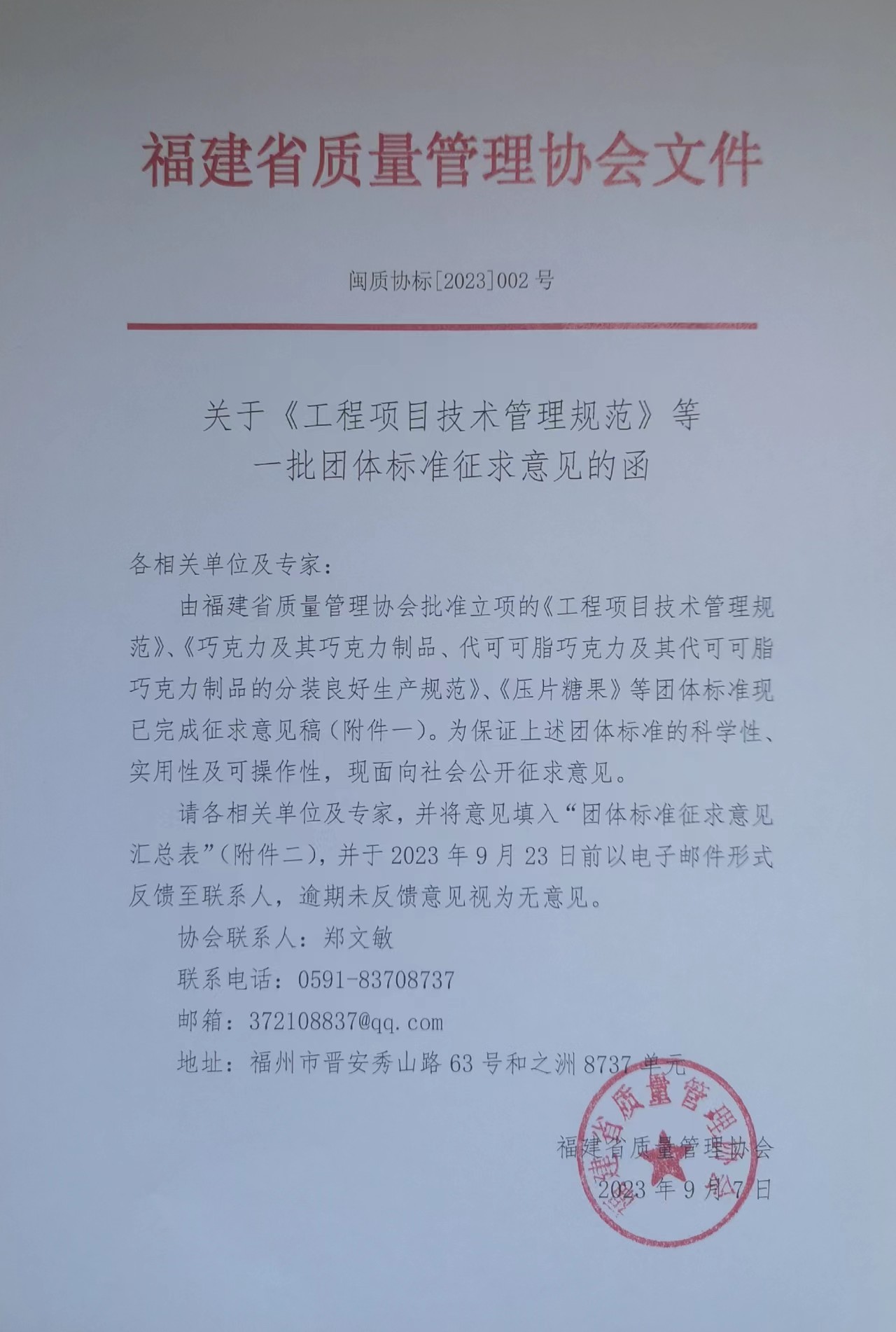 由福建省质量管理协会批准立项的《工程项目技术管理规范》、《巧克力及其巧克力制品、代可可脂巧克力及其代可可脂巧克力制品的分装良好生产规范》、《压片糖果》等团体标准现已完成征求意见稿(附件一)。为保证上述团体标准的科学性、实用性及可操作性,现面向社会公开征求意见。