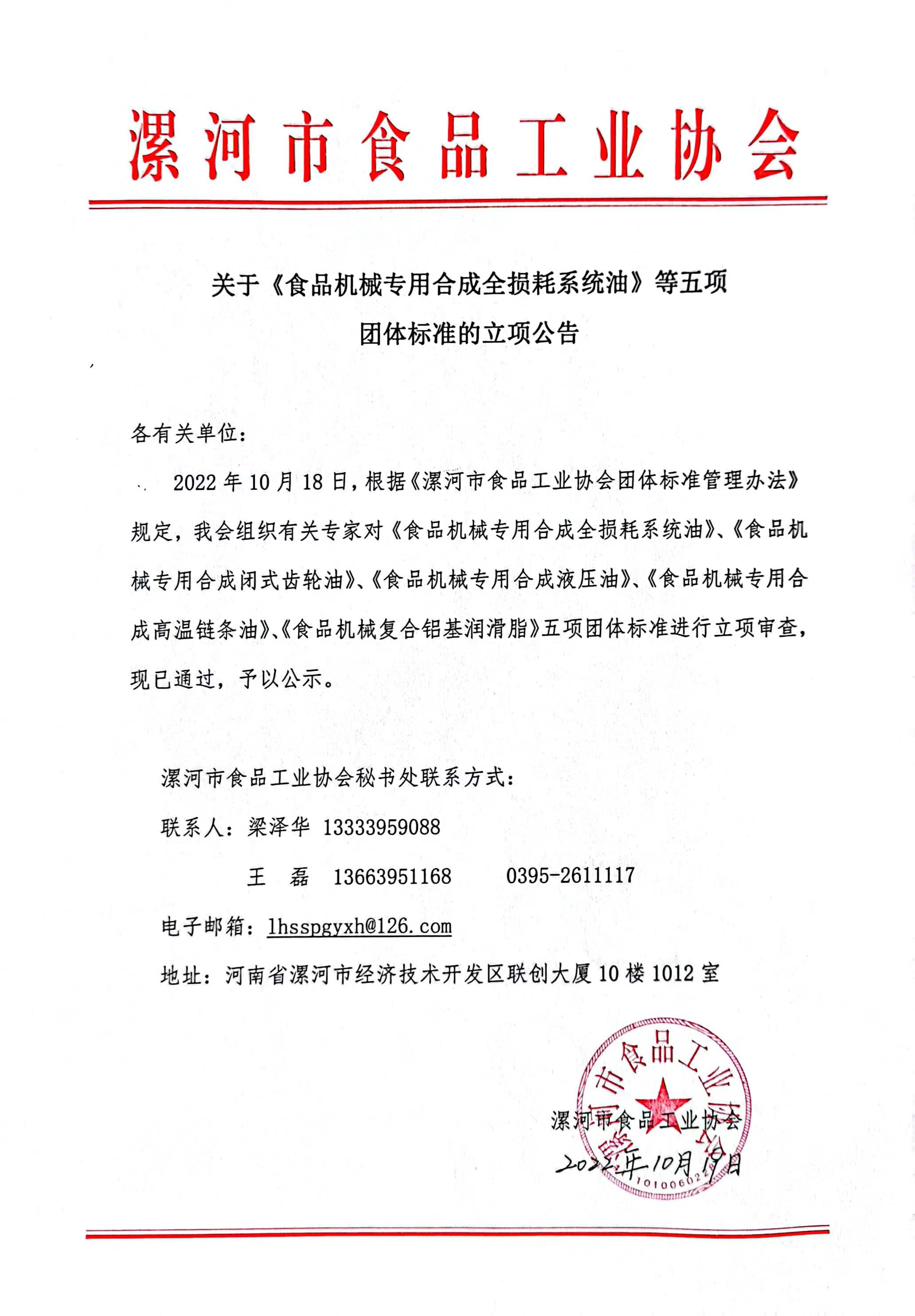 2022年10月18日,根据《漯河市食品工业协会团体标准管理办法》规定,我会组织有关专家对《食品机械专用合成全损耗系统油》、《食品机械专用合成闭式齿轮油》、《食品机械专用合成液压油》、《食品机械专用合成高温链条油》、《食品机械复合铝基润滑脂》五项团体标准进行立项审查,现已通过,予以公示。