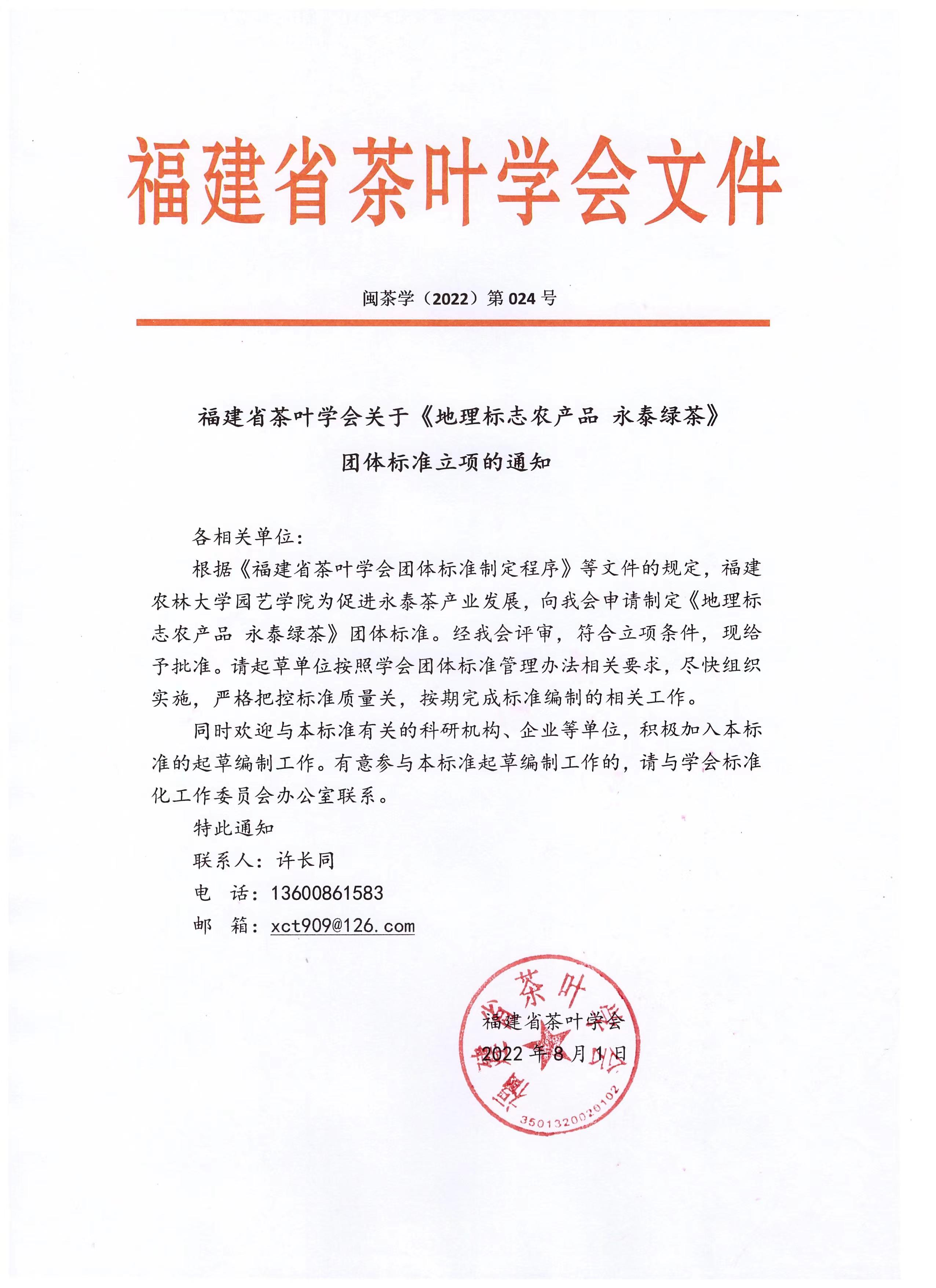 根据《福建省茶叶学会团体标准制定程序》等文件的规定,福建农林大学园艺学院为促进永泰茶产业发展,向我会申请制定《地理标志农产品 永泰绿茶》团体标准。经我会评审,符合立项条件,现给予批准。请起草单位按照学会团体标准管理办法相关要求,尽快组织实施,严格把控标准质量关,按期完成标准编制的相关工作。