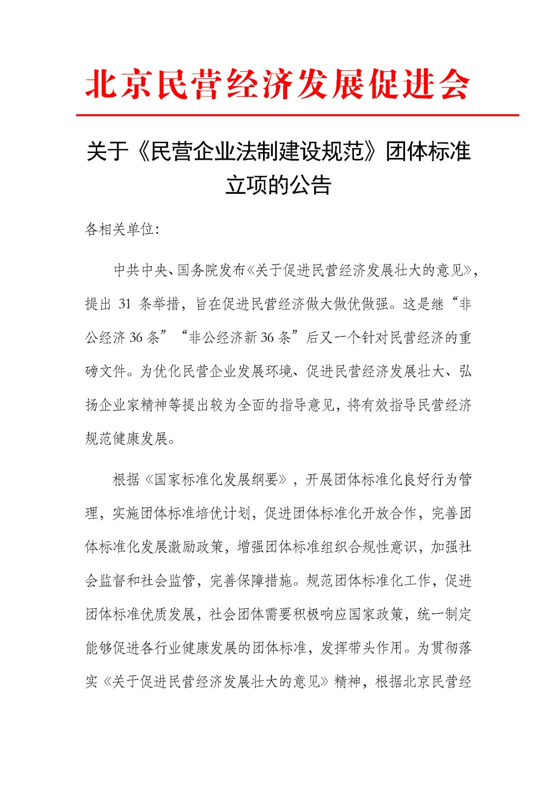 北京民营经济发展促进会关于《民营企业法制建设规范》团体标准立项的公告