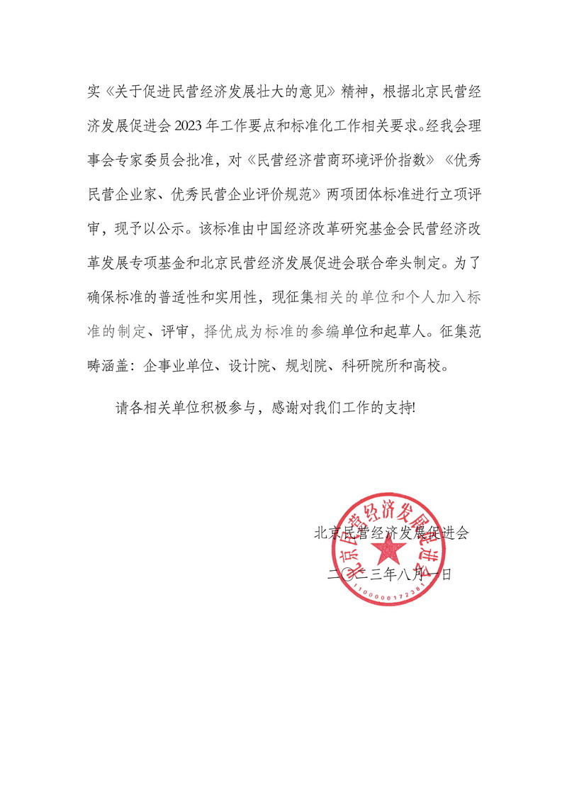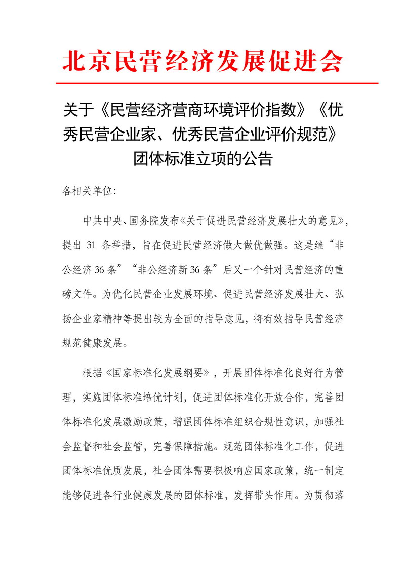 北京民营经济发展促进会关于《民营经济营商环境评价指数》《优秀民营企业家、优秀民营企业评价规范》团体标准立项的公告