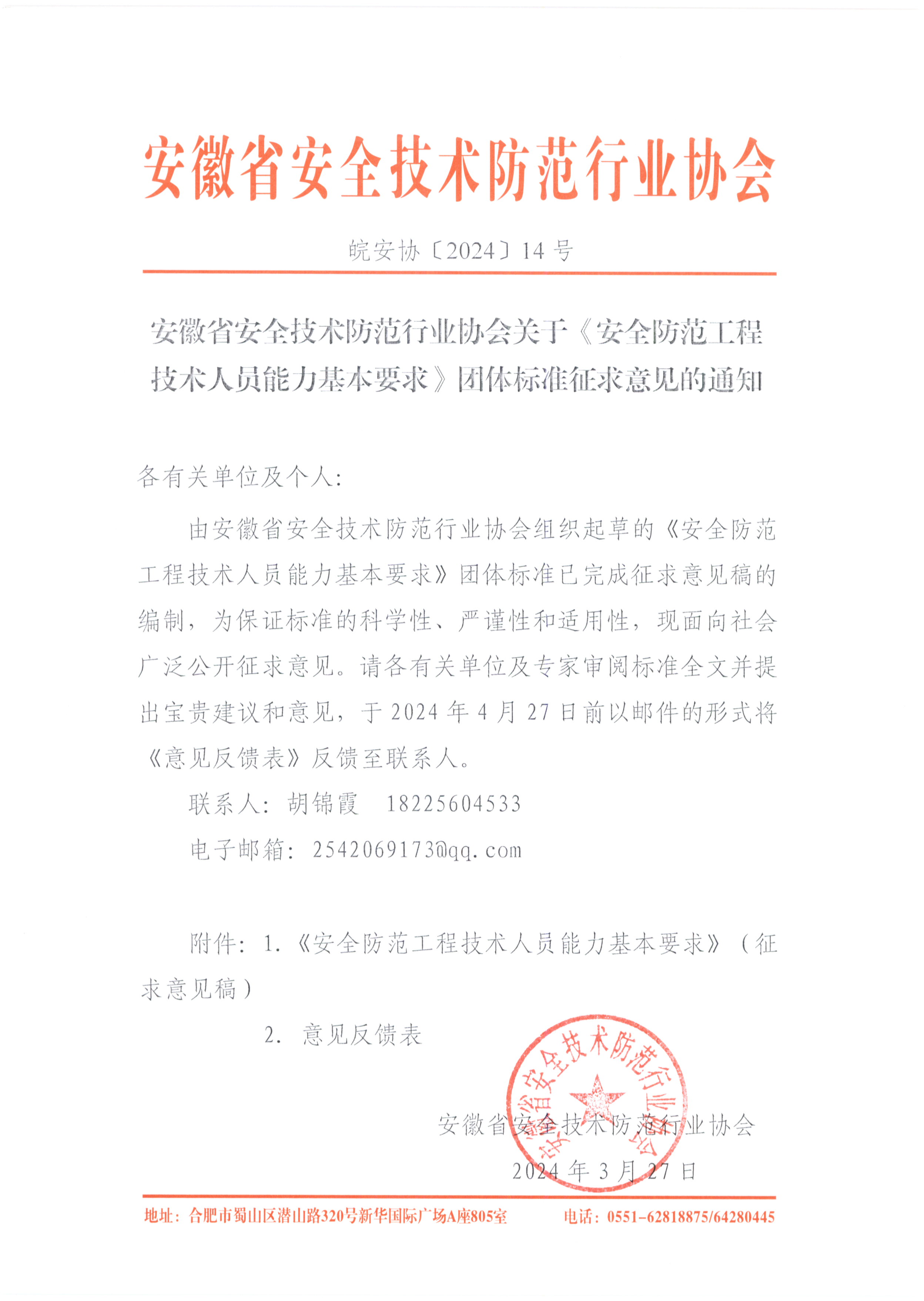 由安徽省安全技术防范行业协会组织起草的《安全防范工程技术人员能力基本要求》团体标准已完成征求意见稿的编制,为保证标准的科学性、严谨性和适用性,现面向社会广泛公开征求意见。请各有关单位及专家审阅标准全文并提出宝贵建议和意见,于2024年4月27日前以邮件的形式将《意见反馈表》反馈至联系人。