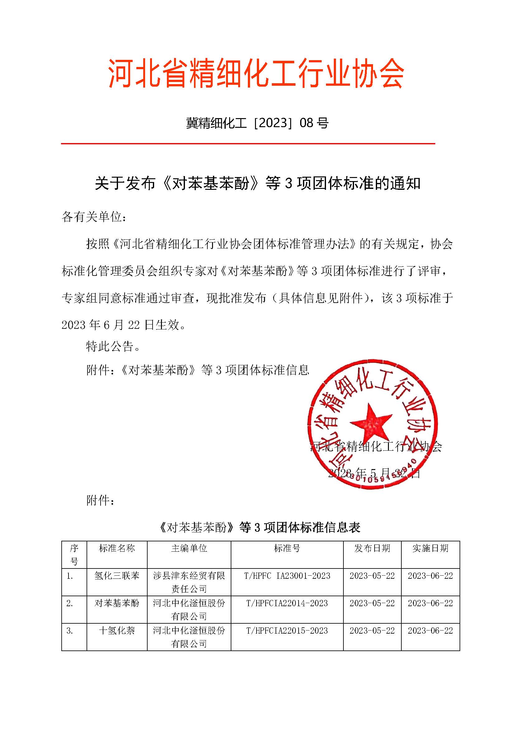 按照《河北省精细化工行业协会团体标准管理办法》的有关规定,协会标准化管理委员会组织专家对《对苯基苯酚》等3项团体标准进行了评审,专家组同意标准通过审查,现批准发布(具体信息见附件),该3项标准于2023年6 月22日生效。