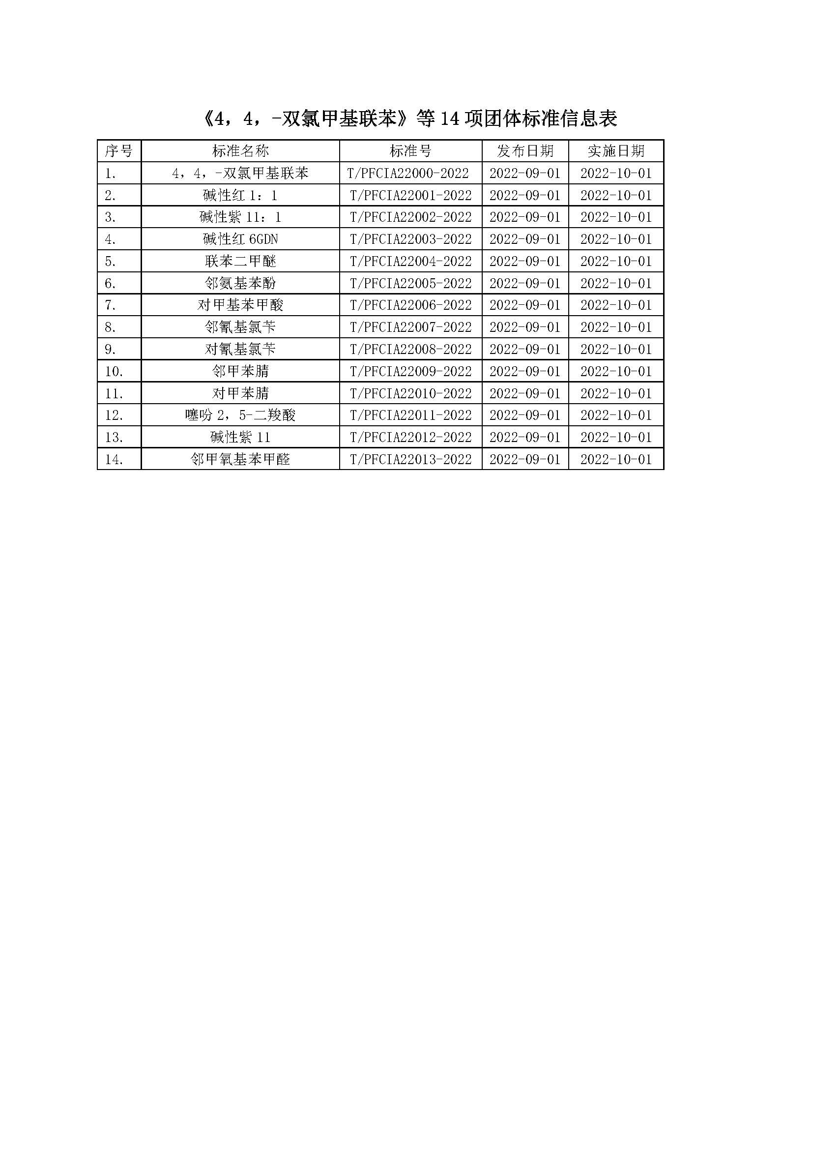 1. | 4,4,-双氯甲基联苯 | T/PFCIA22000-2022 | 2022-09-01 | 2022-10-01 |