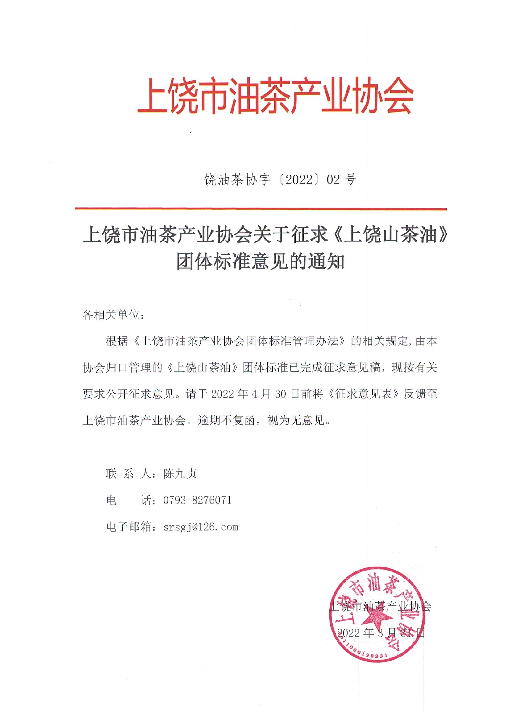 根据《上饶市油茶产业协会团体标准管理办法》的相关规定,由本协会归口管理的《上饶山茶油》团体标准已完成征求意见稿,现按有关要求公开征求意见。请于2022年4月30日前将《征求意见表》反馈至上饶市油茶产业协会。逾期不复函,视为无意见。