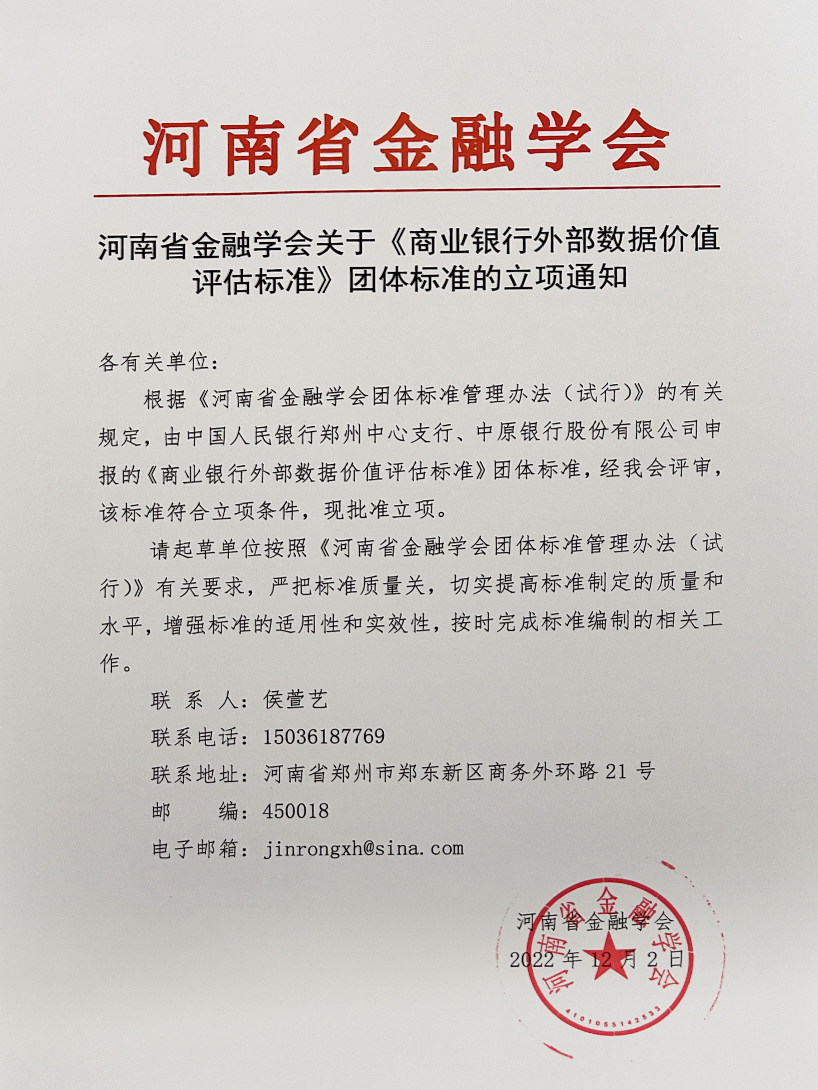 根据《河南省金融学会团体标准管理办法(试行)》的有关规定,由中国人民银行郑州中心支行、中原银行股份有限公司申报的《商业银行外部数据价值评估标准》团体标准,经我会评审,该标准符合立项条件,现批准立项。