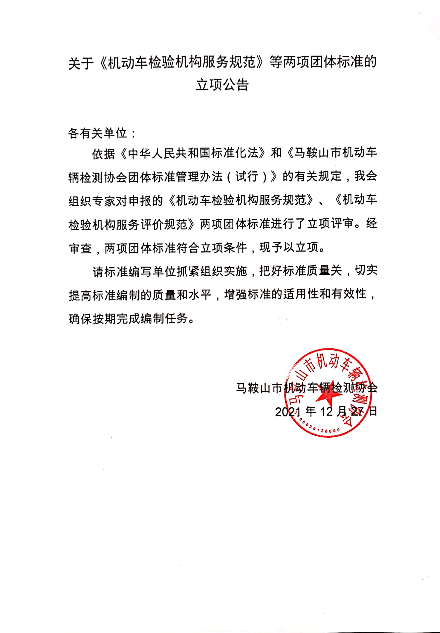 依据《中华人民共和国标准化法》和《马鞍山市机动车辆检测协会团体标准管理办法(试行)》的有关规定,我会组织专家对申报的《机动车检验机构服务规范》、《机动车检验机构服务评价规范》两项团体标准进行了立项评审。经审查,两项团体标准符合立项条件,现予以立项。