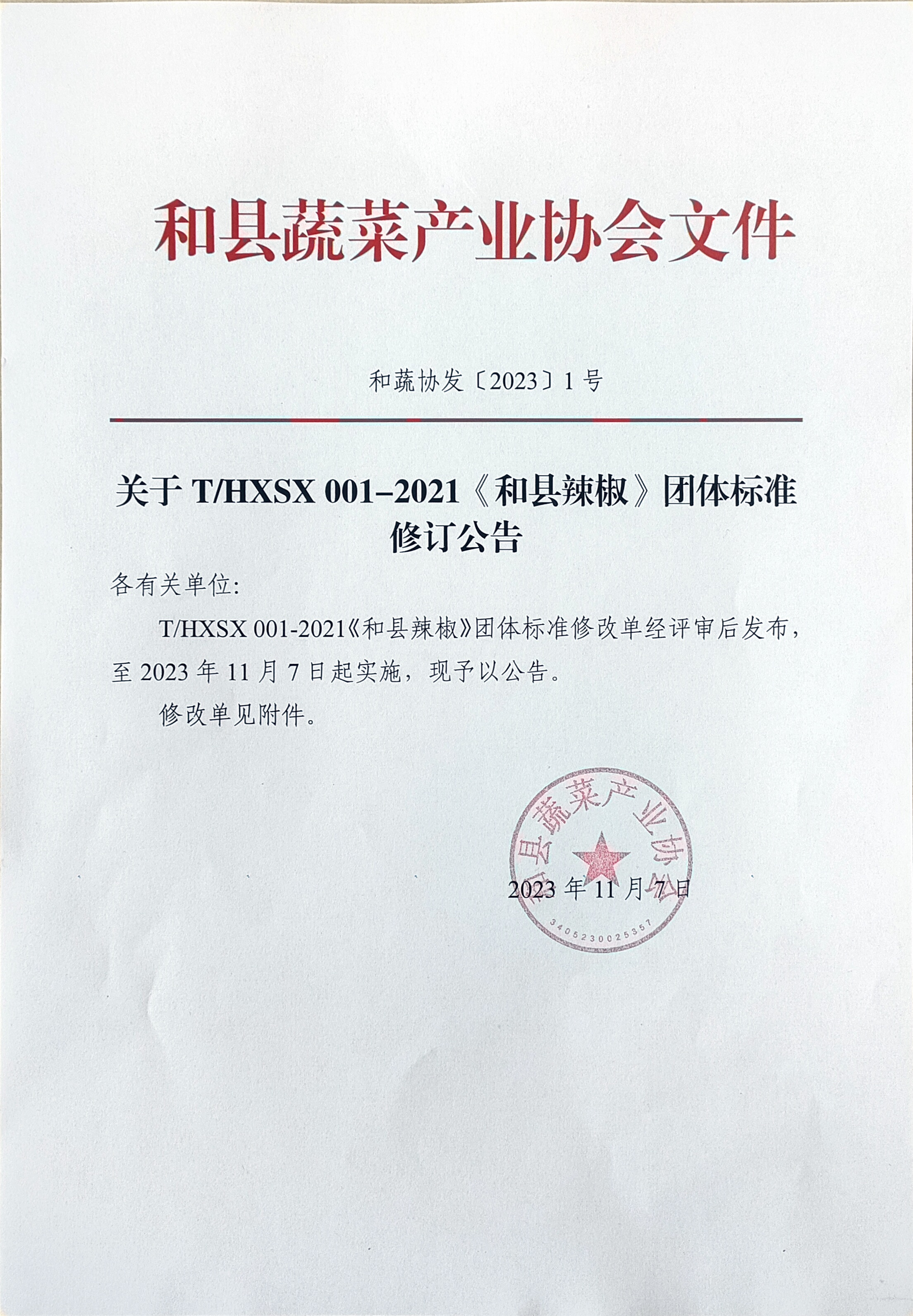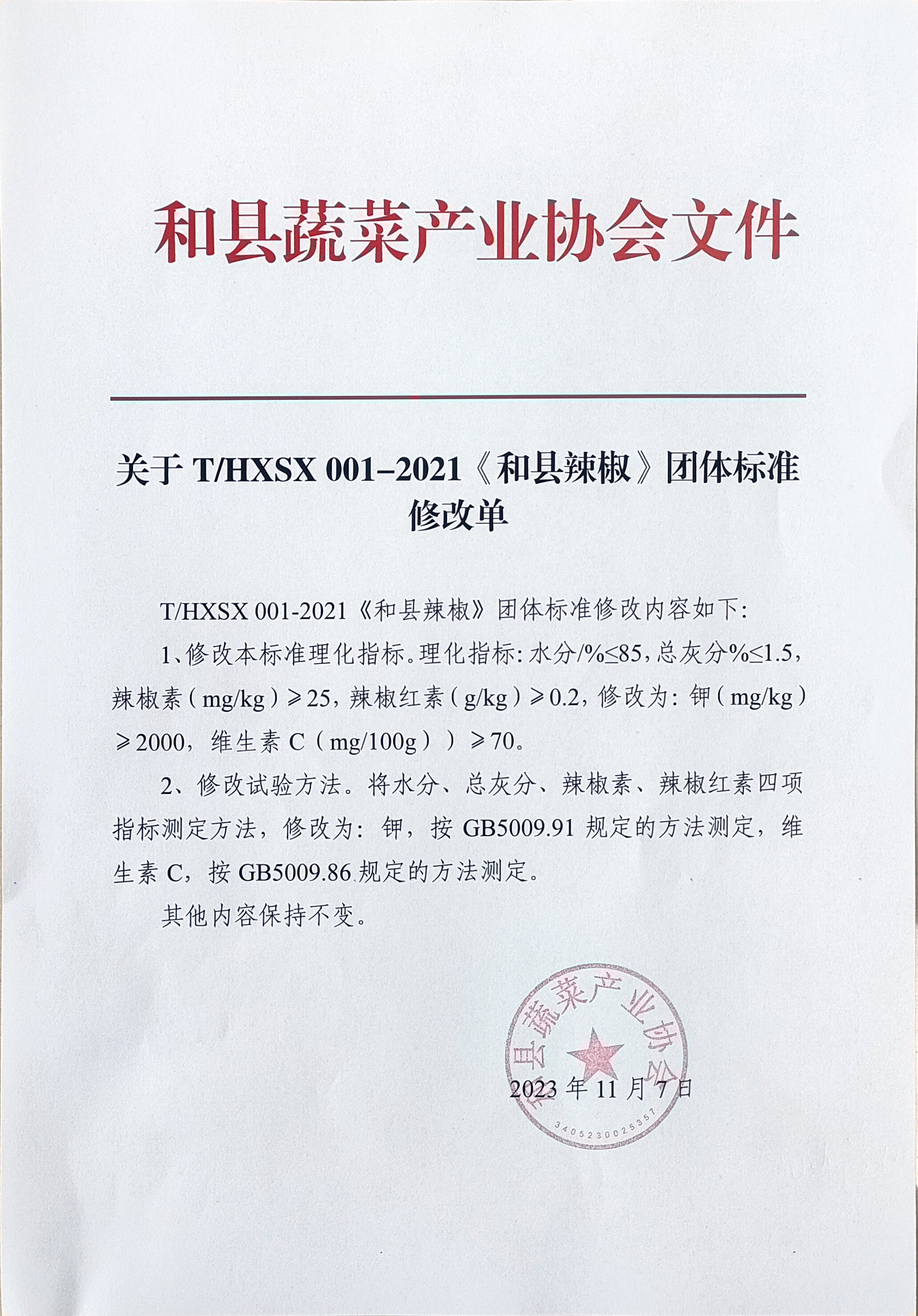 T/HXSX 001-2021《和县辣椒》团体标准第1号修改单经我团体审查批准发布。建议该修改单于2023年11月7日起实施。