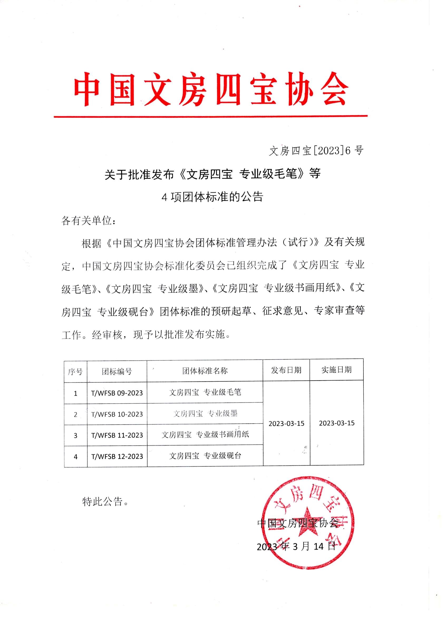 根据《中国文房四宝协会团体标准管理办法(试行)》及有关规定,中国文房四宝协会标准化委员会已组织完成了《文房四宝 专业级毛笔》、《文房四宝 专业级墨》、《文房四宝 专业级书画用纸》、《文房四宝 专业级砚台》团体标准预研起草、征求意见通讯函审、专家审查会议等制定工作,经审核,现予以批准3月15日发布实施。