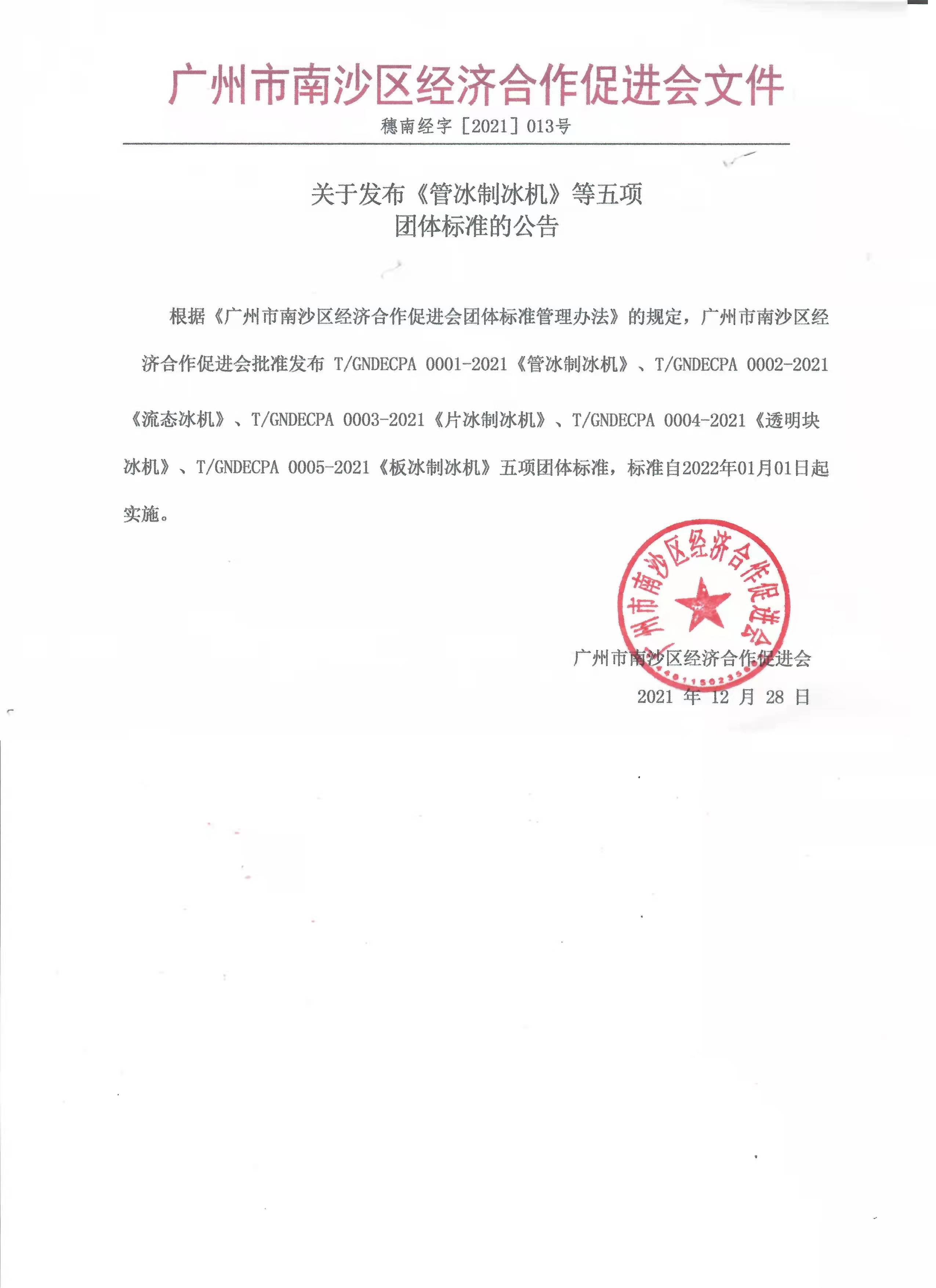 根据《广州市南沙区经济合作促进会团体标准管理办法》的规定,广州市南沙区经济合作促进会批准发布 T/GNDECPA 0001-2021《管冰制冰机》、T/GNDECPA 0002-2021《流态冰机》、T/GNDECPA 0003-2021《片冰制冰机》、T/GNDECPA 0004-2021《透明块冰机》、T/GNDECPA 0005-2021《板冰制冰机》五项团体标准,标准自2022年01月01日起实施。