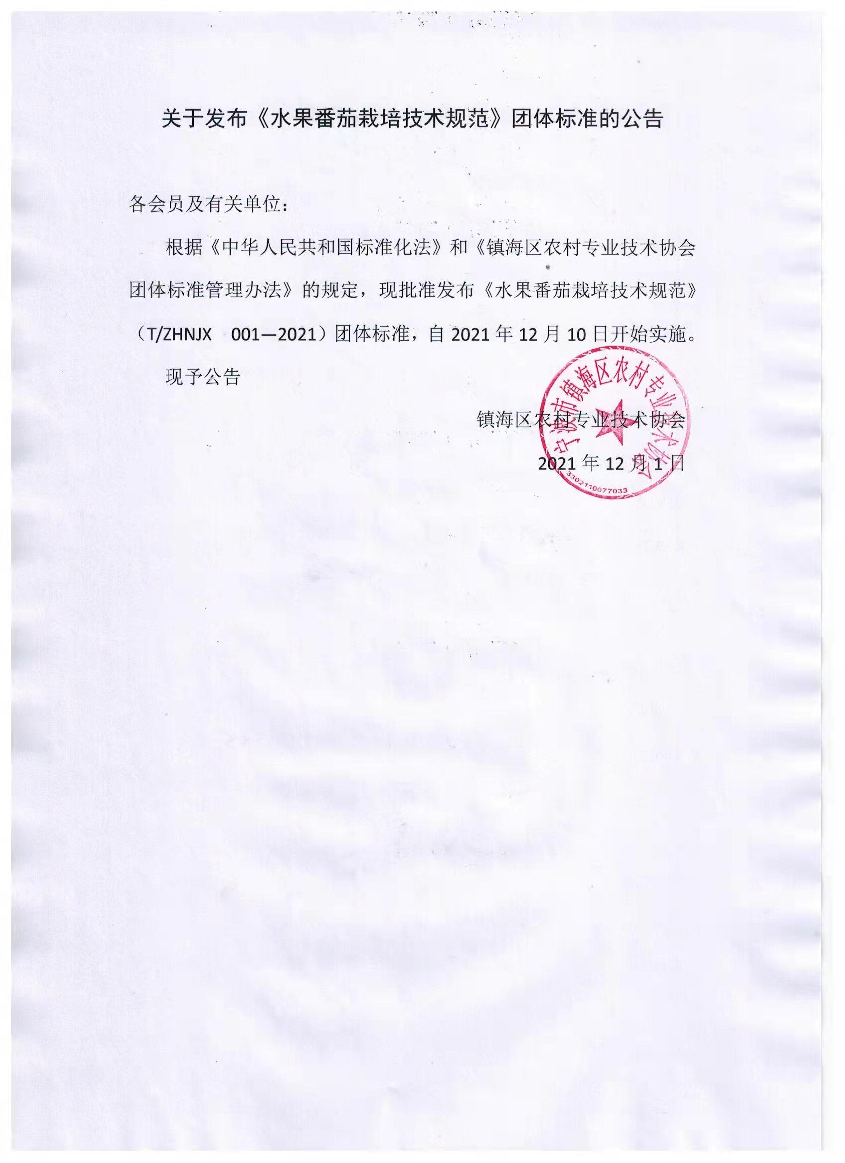 根据《中华人民共和国标准化法》和《宁波市镇海区农村专业技术协会团体标准管理办法》的规定,现批准发布《水果番茄栽培技术规范》(T/ZHNJX 001—2021)团体标准,自2021年12月10日开始实施。