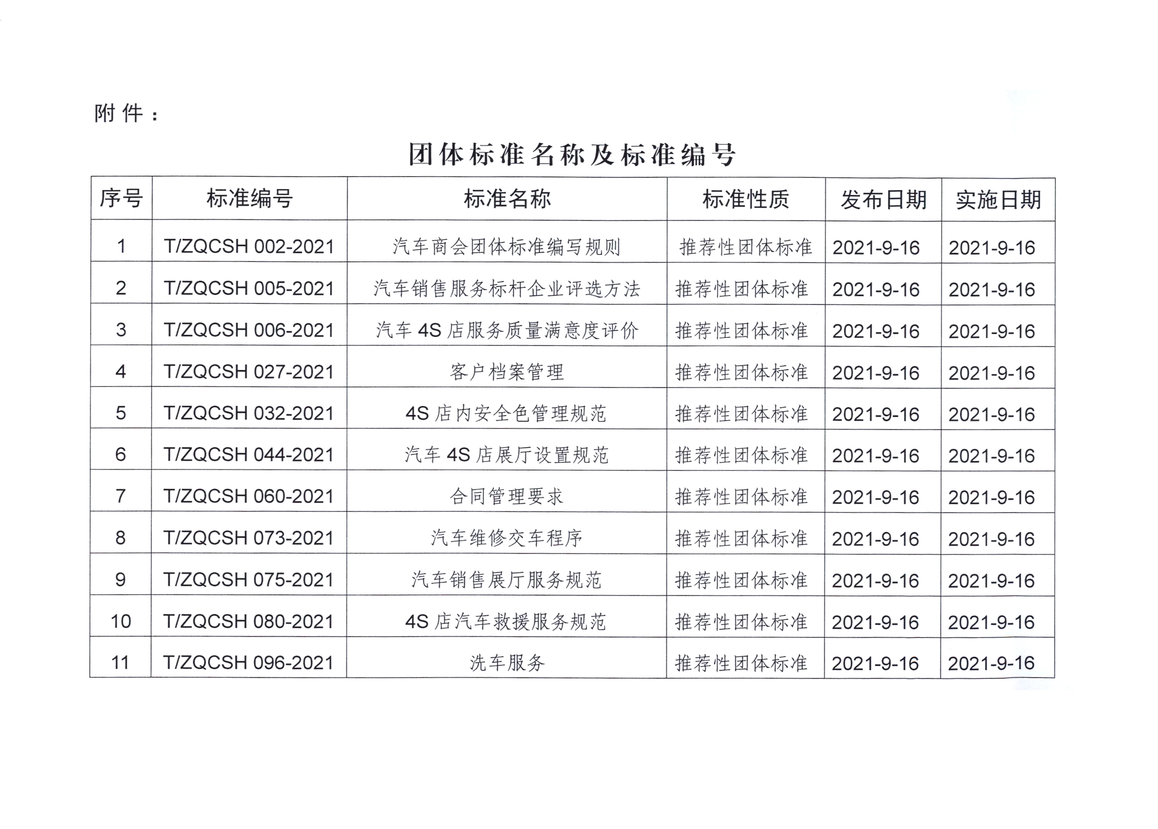 根据《张家口市汽车商会团体标准制定程序》的有关规定,由张家口市汽车商会标准化领导小办公室组织制定的《汽车销售服务标杆企业评选方法》(T/ZQCSH 005-2021)等11项团体标准已按规定程序审查、审批通过,现予发布。该11项团体标准自2021年9月16日实施。