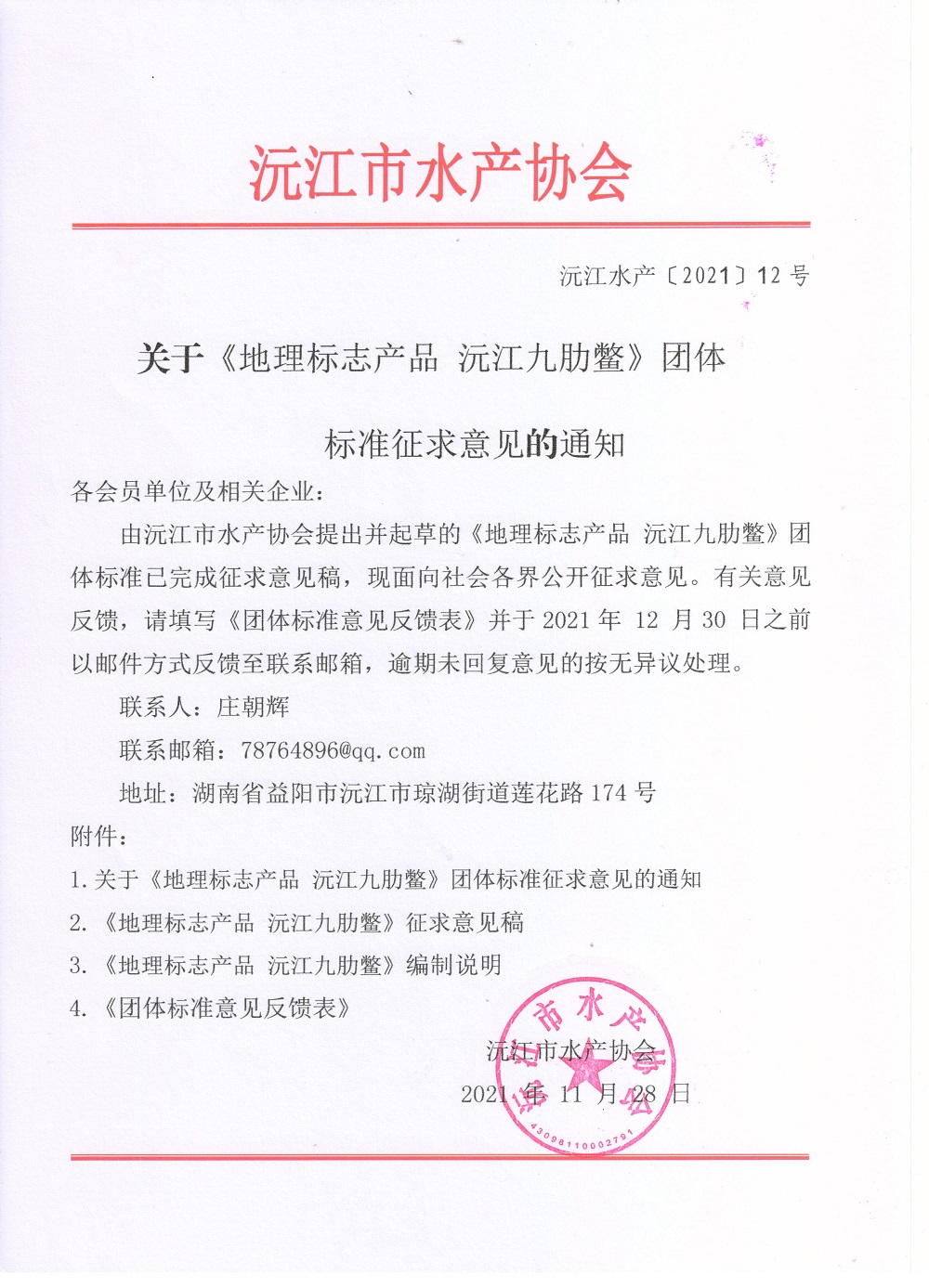 由沅江市水产协会提出并起草的《地理标志产品 沅江九肋鳖》团体标准已完成征求意见稿,现面向社会各界公开征求意见。有关意见反馈,请填写《团体标准意见反馈表》并于2021年 12 月30 日之前以邮件方式反馈至联系邮箱,逾期未回复意见的按无异议处理。