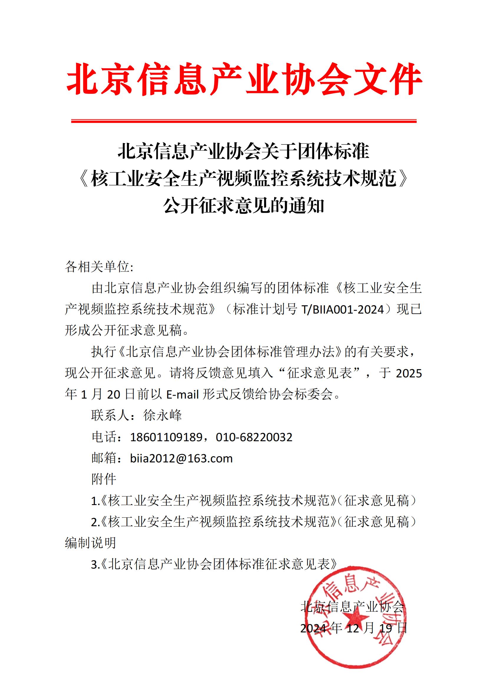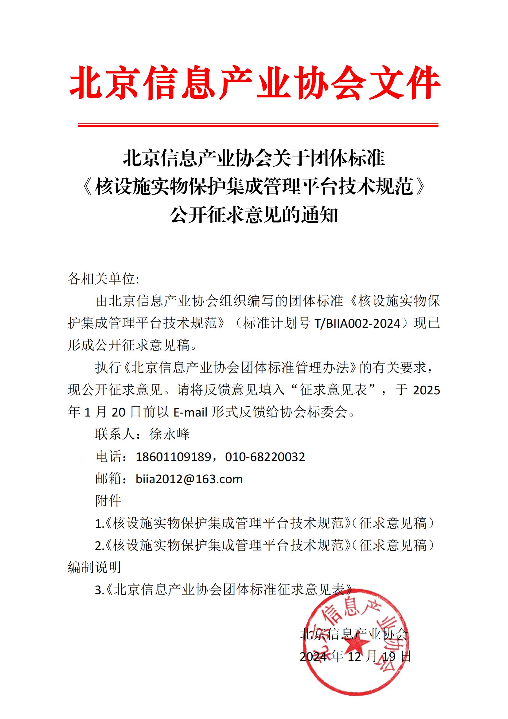 1. 北京信息产业协会关于《核设施实物保护集成管理平台技术规范》团体标准公开征求意见的通知