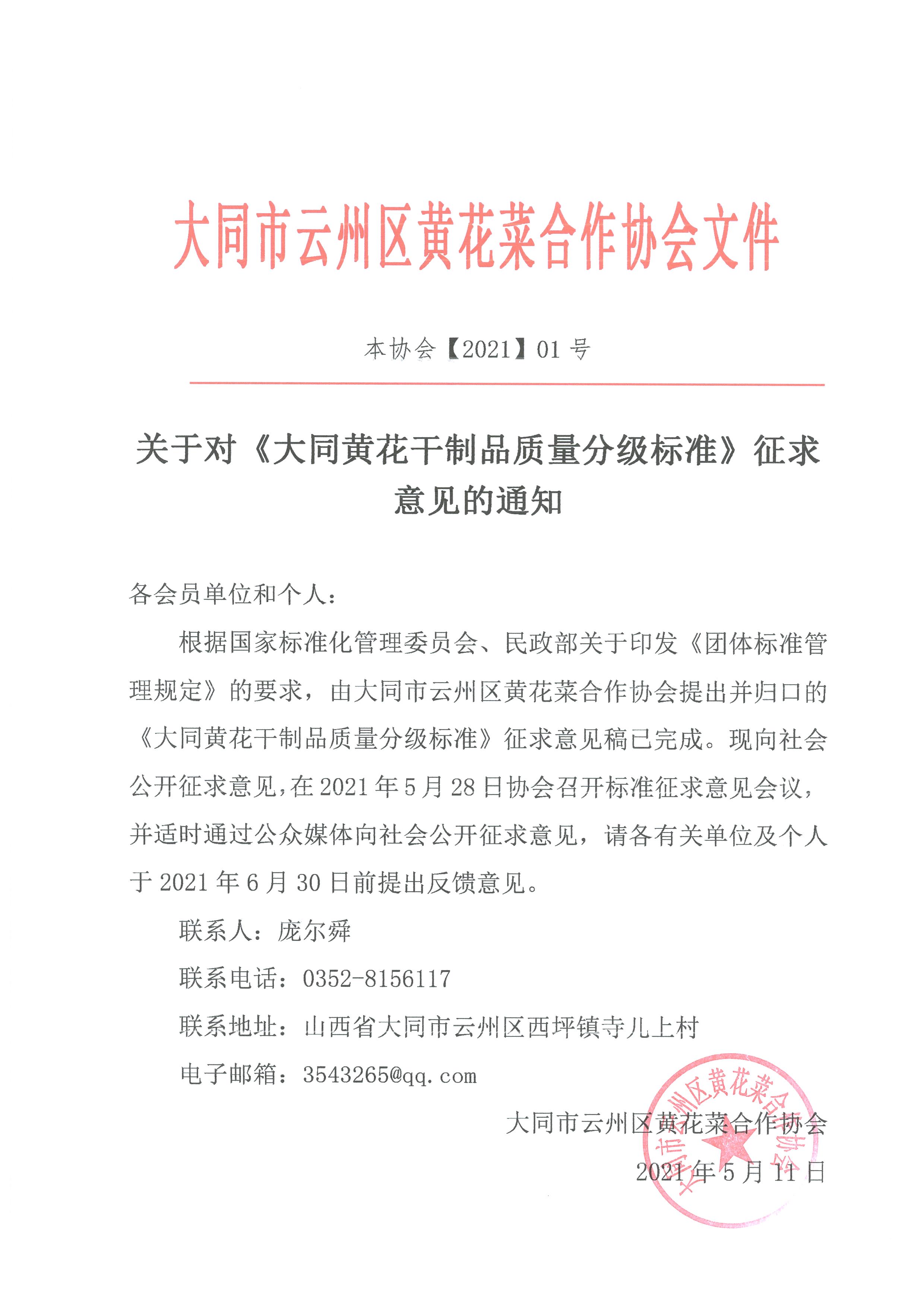 根据国家标准化管理委员会、民政部关于印发《团体标准管理规定》的要求,由大同市云州区黄花菜合作协会提出并归口的《大同黄花干制品质量分级标准》征求意见稿已完成。现向社会公开征求意见,在2021年5月28日协会召开标准征求意见会议,并适时通过公众媒体向社会公开征求意见,请各有关单位及个人于2021年6月30日前提出反馈意见。