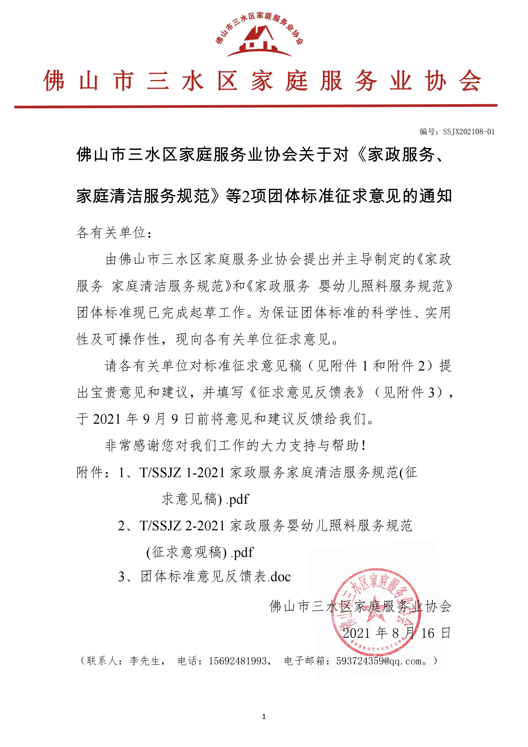 由佛山市三水区家庭服务业协会提出并主导制定的《家政服务 家庭清洁服务规范》和《家政服务 婴幼儿照料服务规范》团体标准现已完成起草工作。为保证团体标准的科学性、实用性及可操作性,现向各有关单位征求意见。