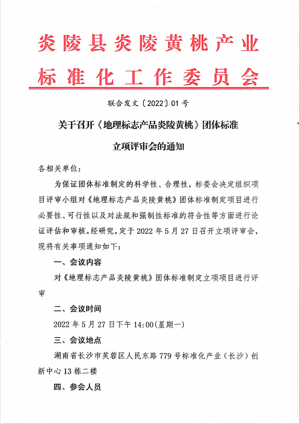 炎陵县炎陵黄桃产业协会关于召开《地理标志产品炎陵黄桃》团体标准立项评审会的通知