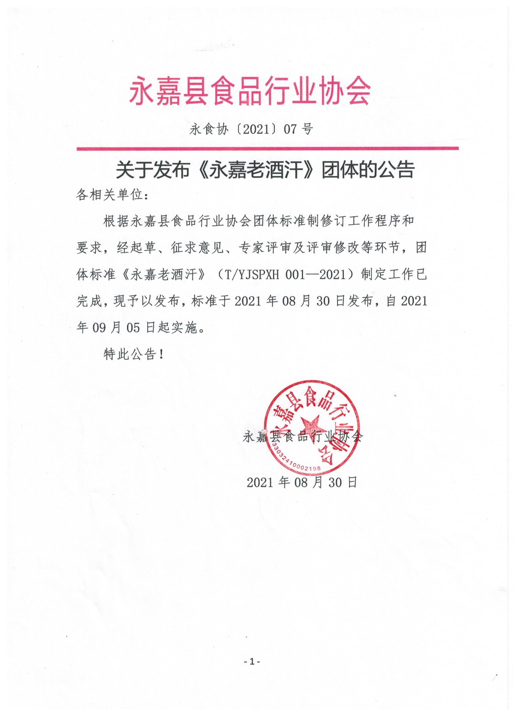 根据永嘉县食品行业协会团体标准制修订工作程序和要求,经起草、征求意见、专家评审及评审修改等环节,团体标准《永嘉老酒汗》(T/YJSPXH 001—2021)制定工作已完成,现予以发布,标准于2021年08月30日发布,自2021年09月05日起实施。