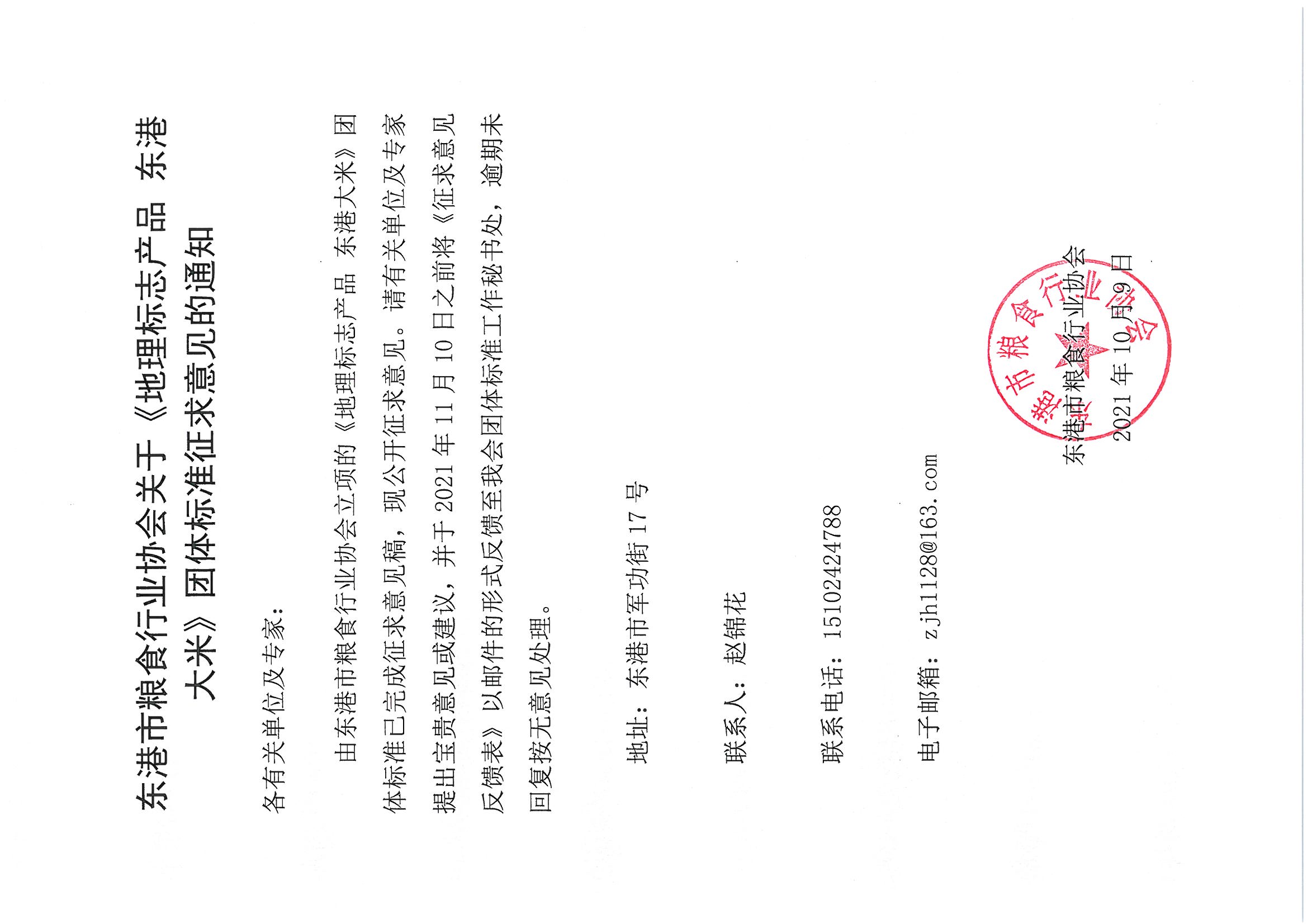 由东港市粮食行业协会立项的《地理标志产品 东港大米》团体标准已完成征求意见稿,现公开征求意见。请有关单位及专家提出宝贵意见或建议,并于2021年11月10日之前将《征求意见反馈表》以邮件的形式反馈至我会团体标准工作秘书处,逾期未回复按无意见处理。