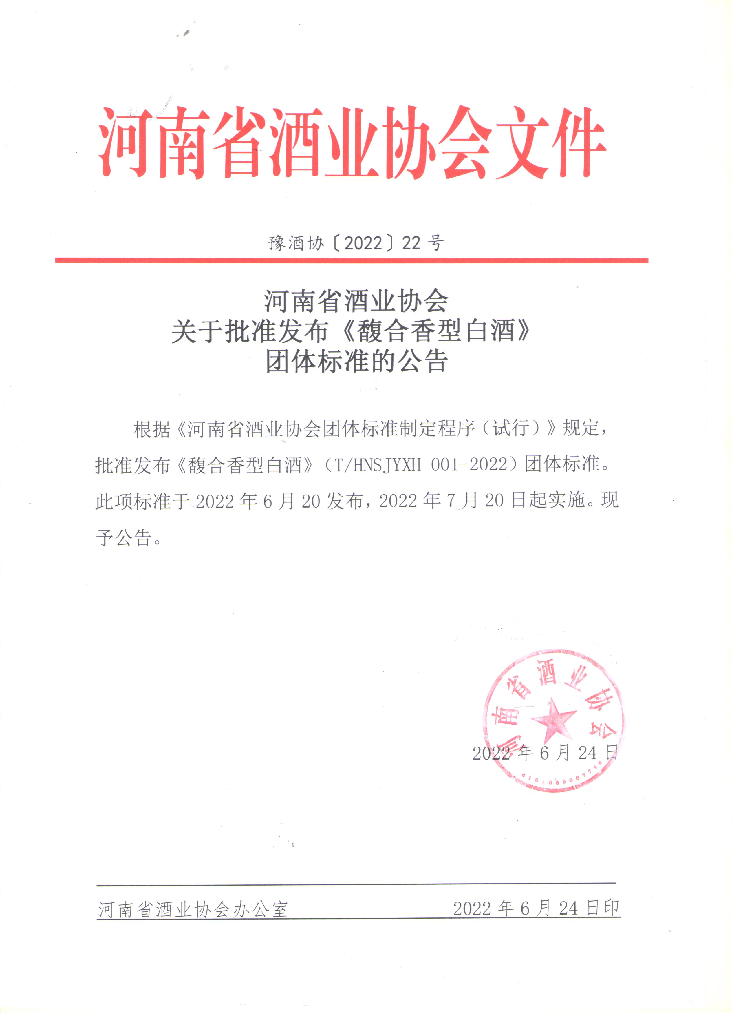 根据《河南省酒业协会团体标准制定程序(试行)》规定,批准发布《馥合香型白酒》(T/HNSJYXH 001-2022)团体标准。此项标准予于2022年6月20日发布,2022年7月20日起实施。现予公告。