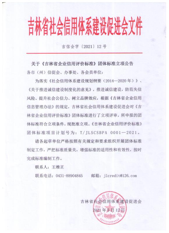 为落实《社会信用体系建设规划纲要(2014—2020年)》、《关于推进诚信建设制度化的意见》,推进诚信建设,防范失信风险、提升社会公信力、树立品牌效应,根据《吉林省企业信用信息管理办法》的规定,吉林省社会信用体系建设促进会对《吉林省企业信用评价标准》团体标准进行了立项评审,所申报的团体标准符合立项条件,现批准立项。《吉林省企业信用评价标准》团体标准项目号为:T/JLSCSBPA 0001—2021。