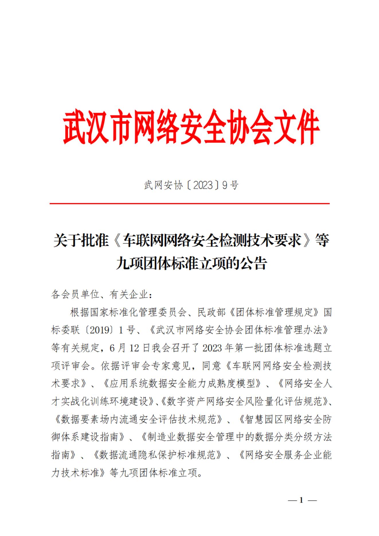 根据国家标准化管理委员会、民政部《团体标准管理规定》国标委联〔2019〕1号、《武汉市网络安全协会团体标准管理办法》等有关规定,6月12日我会召开了2023年第一批团体标准选题立项评审会。依据评审会专家意见,同意《车联网网络安全检测技术要求》、《应用系统数据安全能力成熟度模型》、《网络安全人才实战化训练环境建设》、《数字资产网络安全风险量化评估规范》、《数据要素场内流通安全评估技术规范》、《智慧园区网络安全防御体系建设指南》、《制造业数据安全管理中的数据分类分级方法指南》、《数据流通隐私保护标准规范》、《网络安全服务企业能力技术标准》等九项团体标准立项。