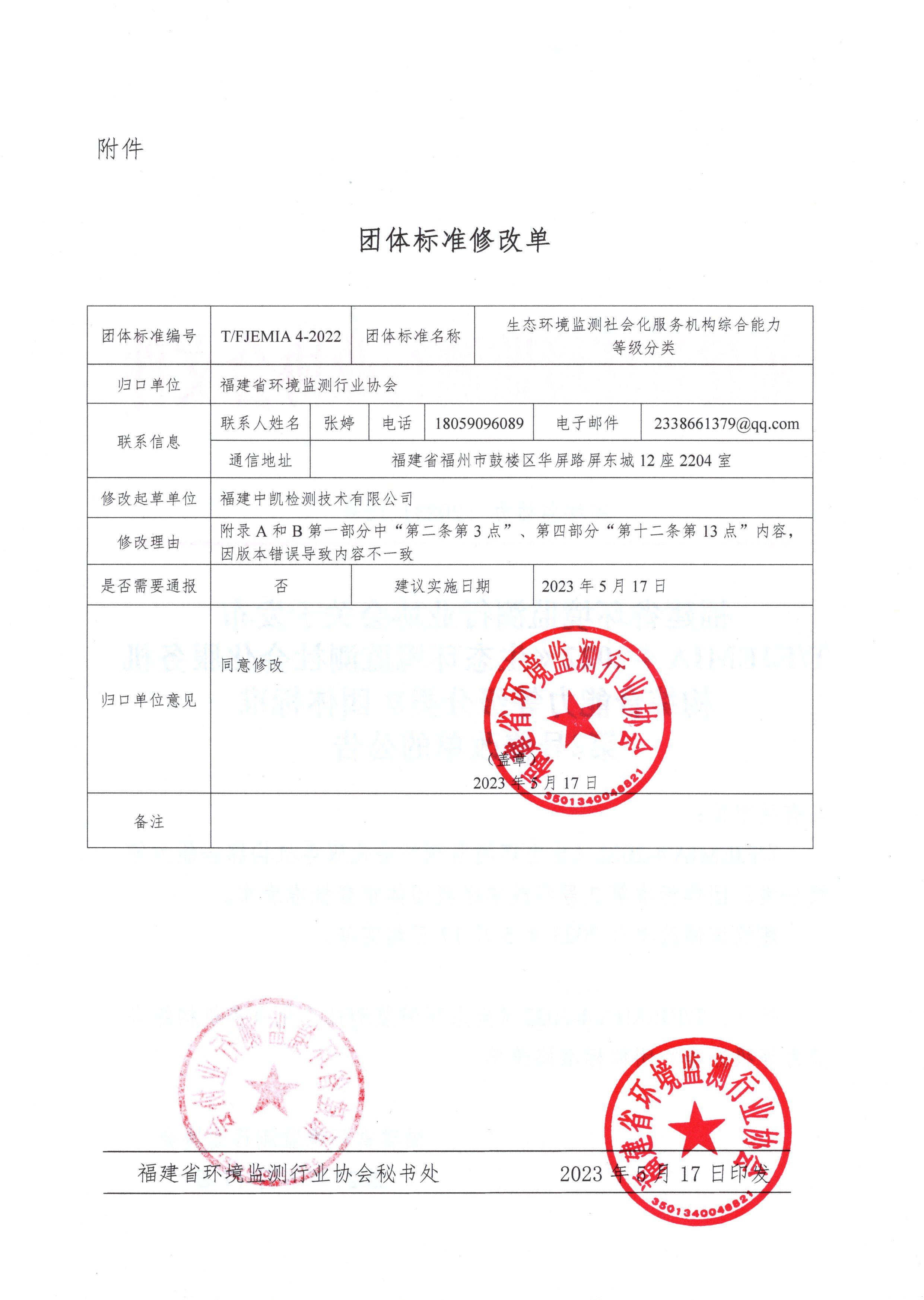 T/FJEMIA 4-2022《生态环境监测社会化服务机构综合能力等级分类》团体标准第2号修改单经我团体审查批准发布。