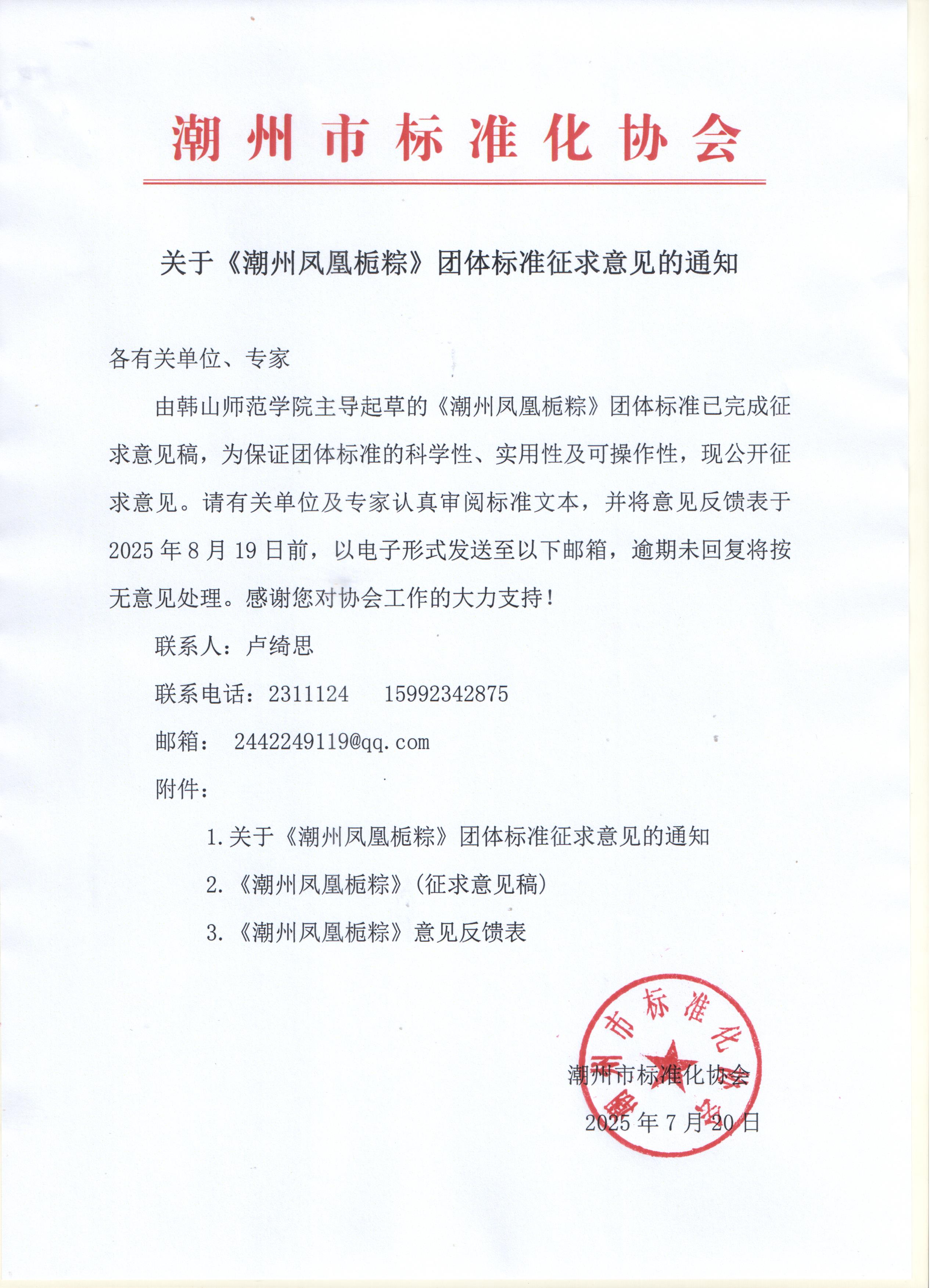 由韩山师范学院主导起草的《潮州凤凰栀粽》团体标准已完成征求意见稿,为保证团体标准的科学性、实用性及可操作性,现公开征求意见。请有关单位及专家认真审阅标准文本,并将意见反馈表于2025年8月19日前,以电子形式发送至以下邮箱,逾期未回复将按无意见处理。感谢您对协会工作的大力支持!