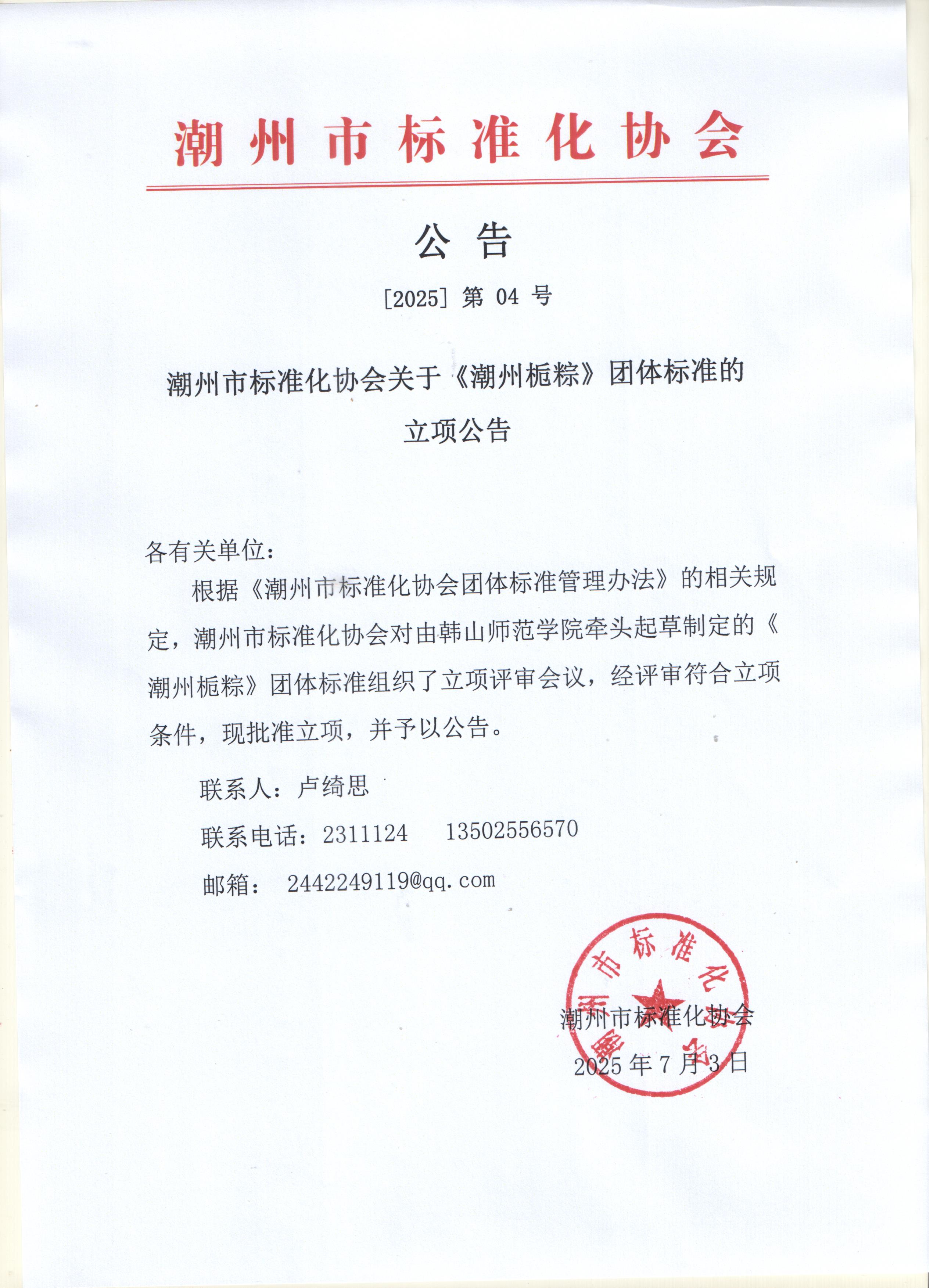 根据《潮州市标准化协会团体标准管理办法》的相关规定,潮州市标准化协会对由韩山师范学院牵头起草制定的《潮州栀粽》团体标准组织了立项评审会议,经评审符合立项条件,现批准立项,并予以公告。