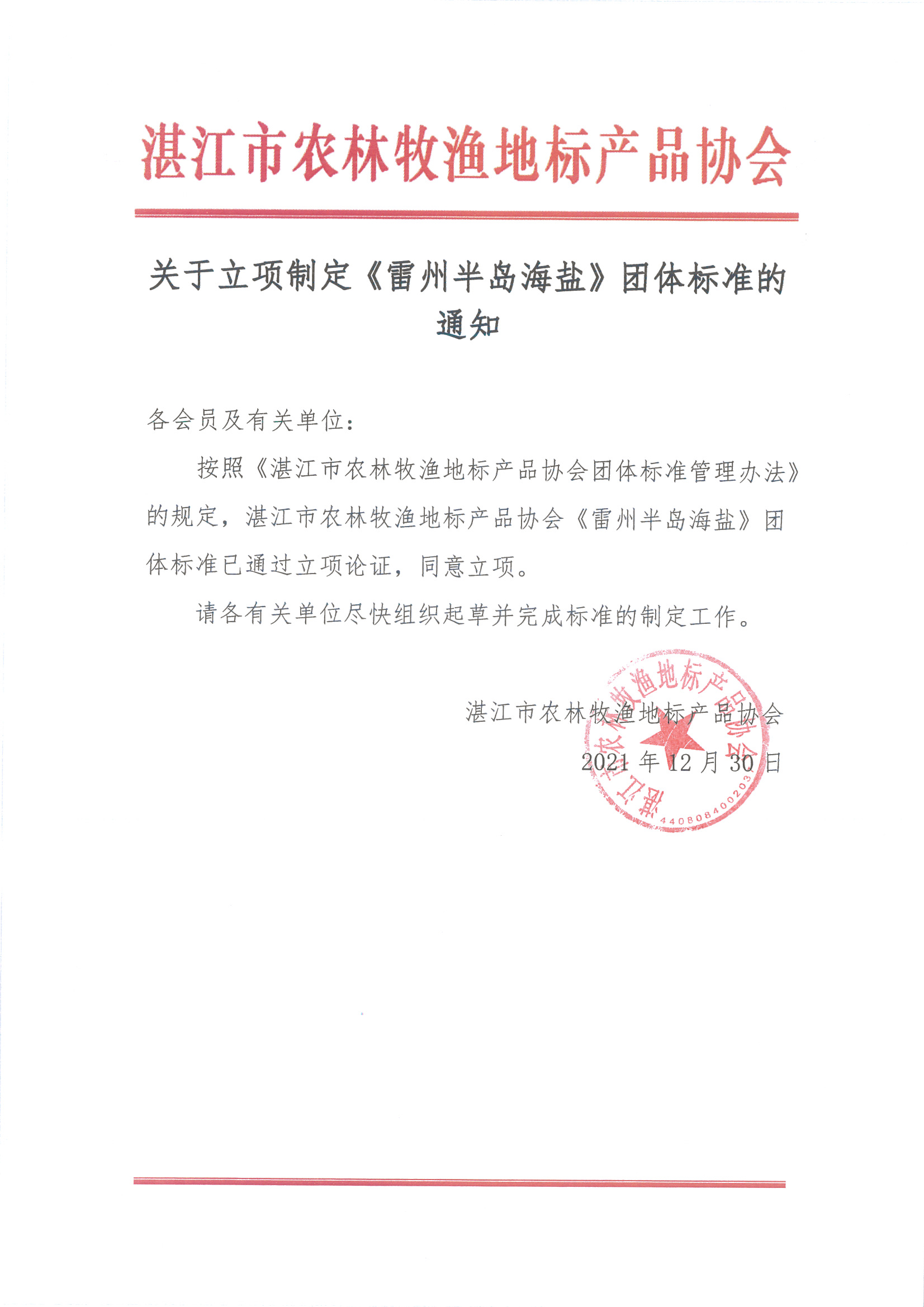 按照《湛江市农林牧渔地标产品协会团体标准管理办法》的规定,湛江市农林牧渔地标产品协会《雷州半岛海盐》团体标准已通过立项论证,同意立项。